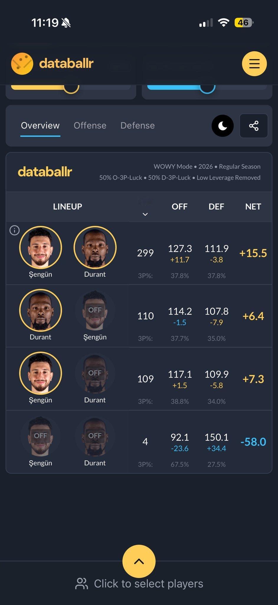 杜兰特和申京同场时,火箭进攻效率127.3,防守效率111.9,净效率+15.5;杜兰特在场而申京不在场时,火箭进攻效率114.2,防守效率107.8,净效率+6.4;杜兰特不在场而申京在场时,火箭进攻效率117.1,防守效率109.9,净效率+7.3;杜兰特和申京都不在场时,火箭进攻效率92.1,防守效率150.1,净效率-58。(已经剔除垃圾时间)
