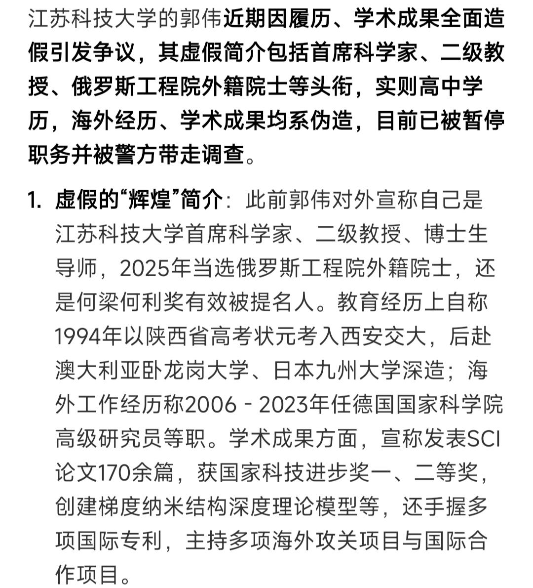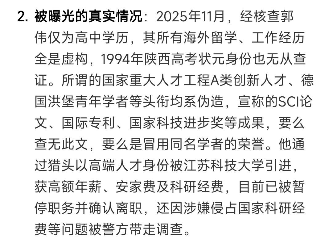 学术造假到这种地步。短剧剧本都不敢这么写。一个高中生,把自己包装成高考状元,海归,海外院士,造成自己发表了100多篇SCI论文,获得了国家科技进步奖,手握多项国际专利,打入大学内部成为首席科学家。而这一切,除了高中生这个身份是真实的以外,其他都是假的。 可怕的不是江苏科技大学这个首席科学家造假,而是他怎么通过一层一层的审核,一跃而成为首席科学家的?这才是最可怕的。感觉是他说什么他们就相信什么。 如果学术界来一次大规模的学术打假,像郭伟这样的学术骗子,应该不在少数。教育 学术黑幕