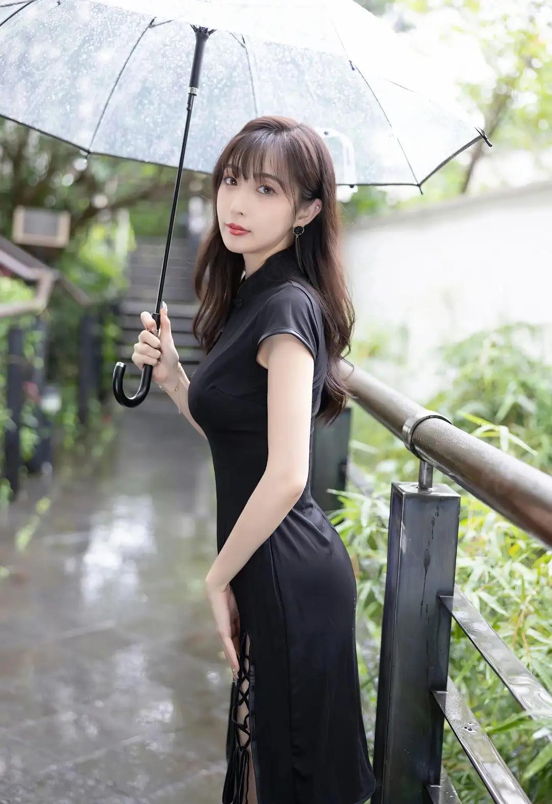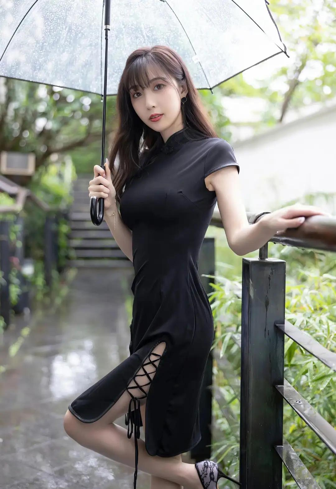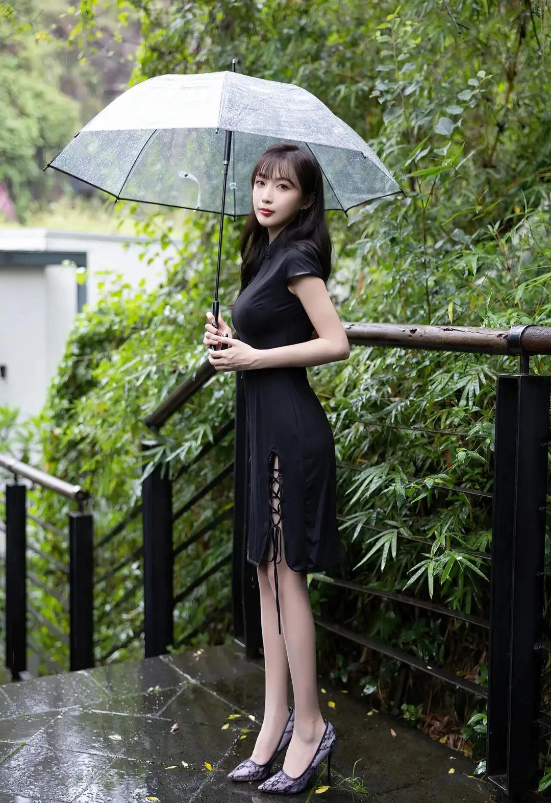 伞骨承着雨滴的重量微微颤动时,我忽然明白江南的梅雨是有骨头的。她握着透明伞柄的指节泛着玉色,黑色旗袍的立领贴着颈线,盘扣像两粒墨玉,在雨雾里洇着温润的光。伞檐垂落的水珠串成水晶帘,隔着这层流动的屏障,她小腿的轮廓在开衩处若隐若现,踩着紫色高跟鞋的足尖正轻轻点过青石板上的水洼。 雨丝斜斜地穿过伞面,在她肩头绣出细密的银针。旗袍下摆的黑色绸缎吸饱了水汽,随着步伐泛出深潭般的幽光。那双缀着蕾丝的高跟每次抬起,鞋尖都会带起一串细碎的水花,像紫藤萝垂落时惊起的雀群。栏杆上的木纹被雨水泡得发亮,蜿蜒的纹路里淌着琥珀色的时光。 这让我想起外婆樟木箱底那件褪色的阴丹士林布旗袍,领口同样钉着盘花扣。她总说老物件会认主,此刻雨帘中的身影与记忆重叠,方知所谓风韵原是岁月酿的梅子酒,越是经年越见醇色。当她的伞面掠过竹叶时,我忽然听见三十年前弄堂里飘来的评弹——原来每滴雨都藏着半阕《秦淮景》。