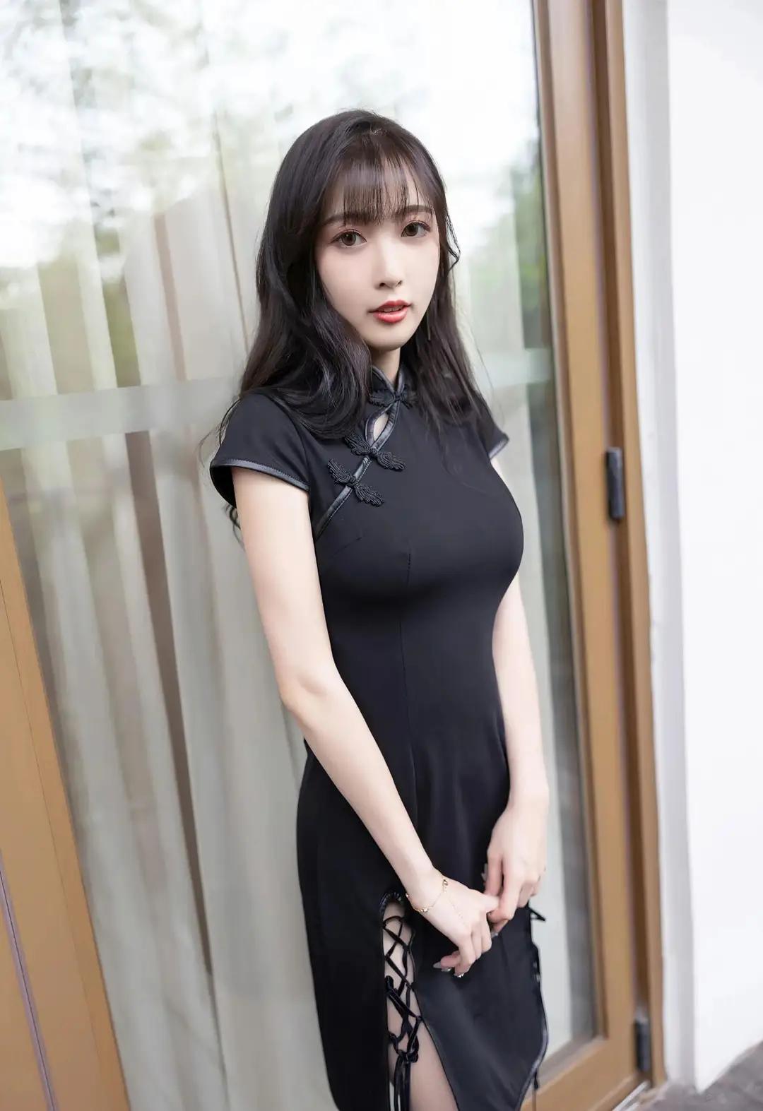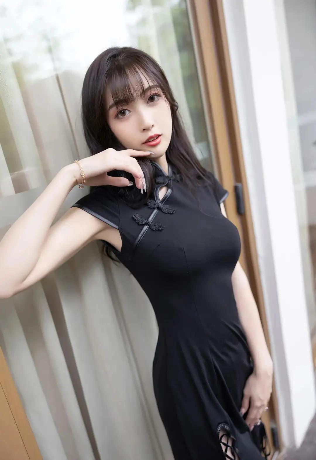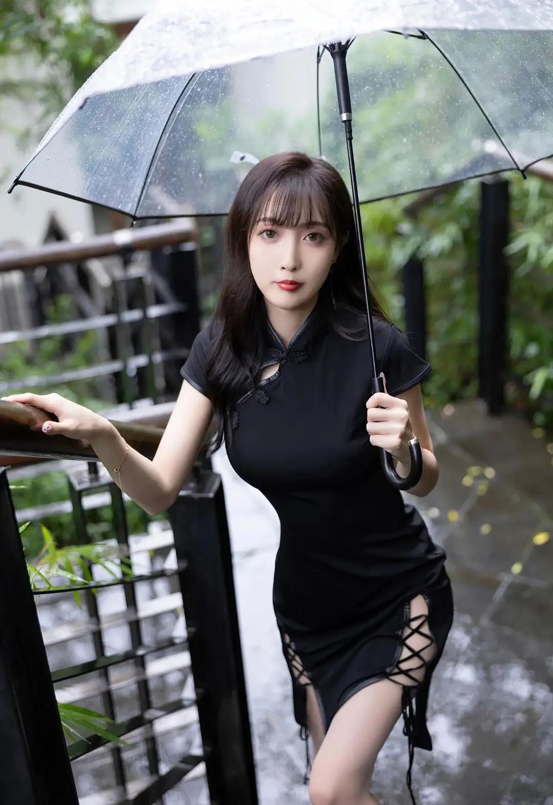 伞骨承着雨滴的重量微微颤动时,我忽然明白江南的梅雨是有骨头的。她握着透明伞柄的指节泛着玉色,黑色旗袍的立领贴着颈线,盘扣像两粒墨玉,在雨雾里洇着温润的光。伞檐垂落的水珠串成水晶帘,隔着这层流动的屏障,她小腿的轮廓在开衩处若隐若现,踩着紫色高跟鞋的足尖正轻轻点过青石板上的水洼。 雨丝斜斜地穿过伞面,在她肩头绣出细密的银针。旗袍下摆的黑色绸缎吸饱了水汽,随着步伐泛出深潭般的幽光。那双缀着蕾丝的高跟每次抬起,鞋尖都会带起一串细碎的水花,像紫藤萝垂落时惊起的雀群。栏杆上的木纹被雨水泡得发亮,蜿蜒的纹路里淌着琥珀色的时光。 这让我想起外婆樟木箱底那件褪色的阴丹士林布旗袍,领口同样钉着盘花扣。她总说老物件会认主,此刻雨帘中的身影与记忆重叠,方知所谓风韵原是岁月酿的梅子酒,越是经年越见醇色。当她的伞面掠过竹叶时,我忽然听见三十年前弄堂里飘来的评弹——原来每滴雨都藏着半阕《秦淮景》。
