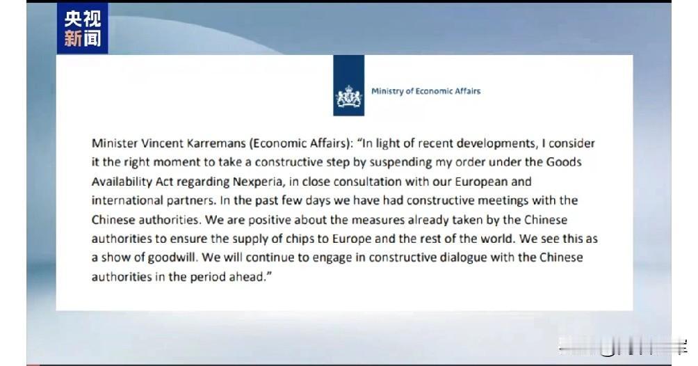 荷兰暂停对安世半导体的行政令出于何种考虑?意识形态让位于务实合作,将成为未来中欧科技合作中不可回避的趋势。在稀土元素方面必须给荷兰卡得死死的,必须让她感受到痛,否则谁都想踩上一脚。我们务必对荷兰进行有效的各种制裁,让他永远记住对我们轻视会带来严重后果和教训。荷兰主动暂停对安世半导体行政令是具有积极意义的!荷兰以接受美国所谓的“穿透规则”及“国家安全”为由施压对闻泰科技(安世半导体)这种倒反天罡的制裁决定,只会让事情变得愈加复杂,最终导致的后果一定会反噬到荷兰的自身经济,我们一定会予以迎头痛击坚决反制。历史经验表明如果与美国亦步亦趋、沆瀣一气的话,不但被美国当作棋子用,更会被当作弃子的悲惨下场!!!