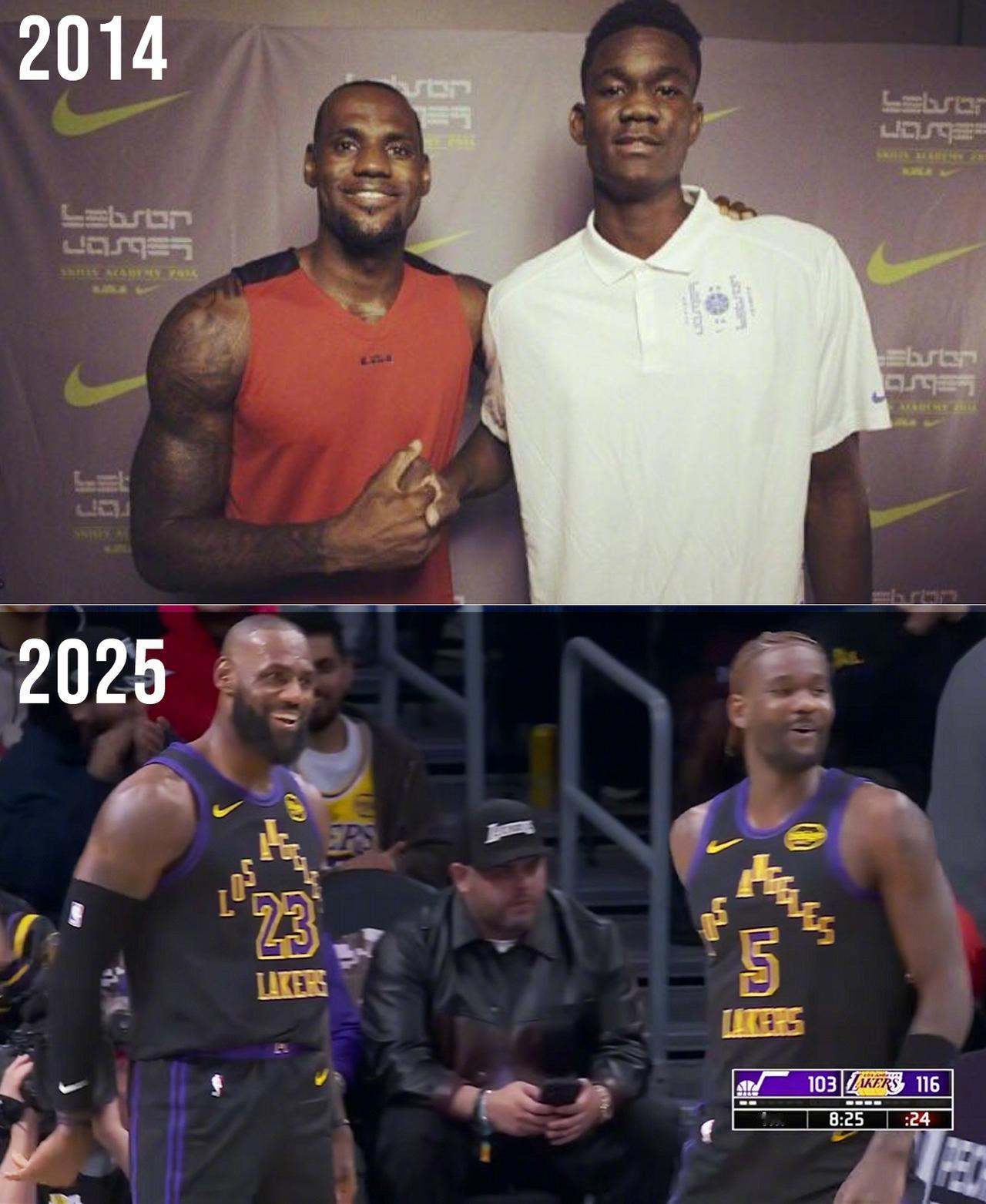 詹姆斯又长高了吗? 詹姆斯首秀给艾顿传了个空接,但其实早在11年前,艾顿接接过老詹的空接传球。 艾顿说:“我和詹姆斯说‘这是你给我的第二次空接。第一次是在我上八年级、去你训练营的时候。’我到现在都记得那个回合。他当时在各个场地之间跑来跑去,跟营里的孩子一起打球。他把那球往上一抛,我接到空接完成了。我当时都不敢相信他会把球抛给我。现在又一次,我还是不敢相信他真的把这球抛上来了。”