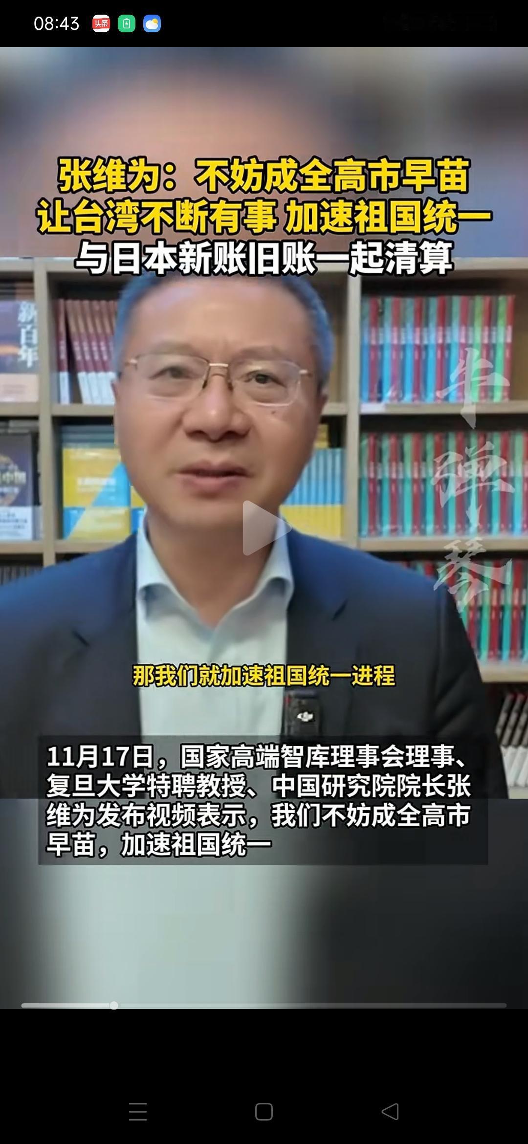 张维为教授与众不同,他说,“我们不妨成全高市早苗,加速祖国统一”。既然“台湾有事