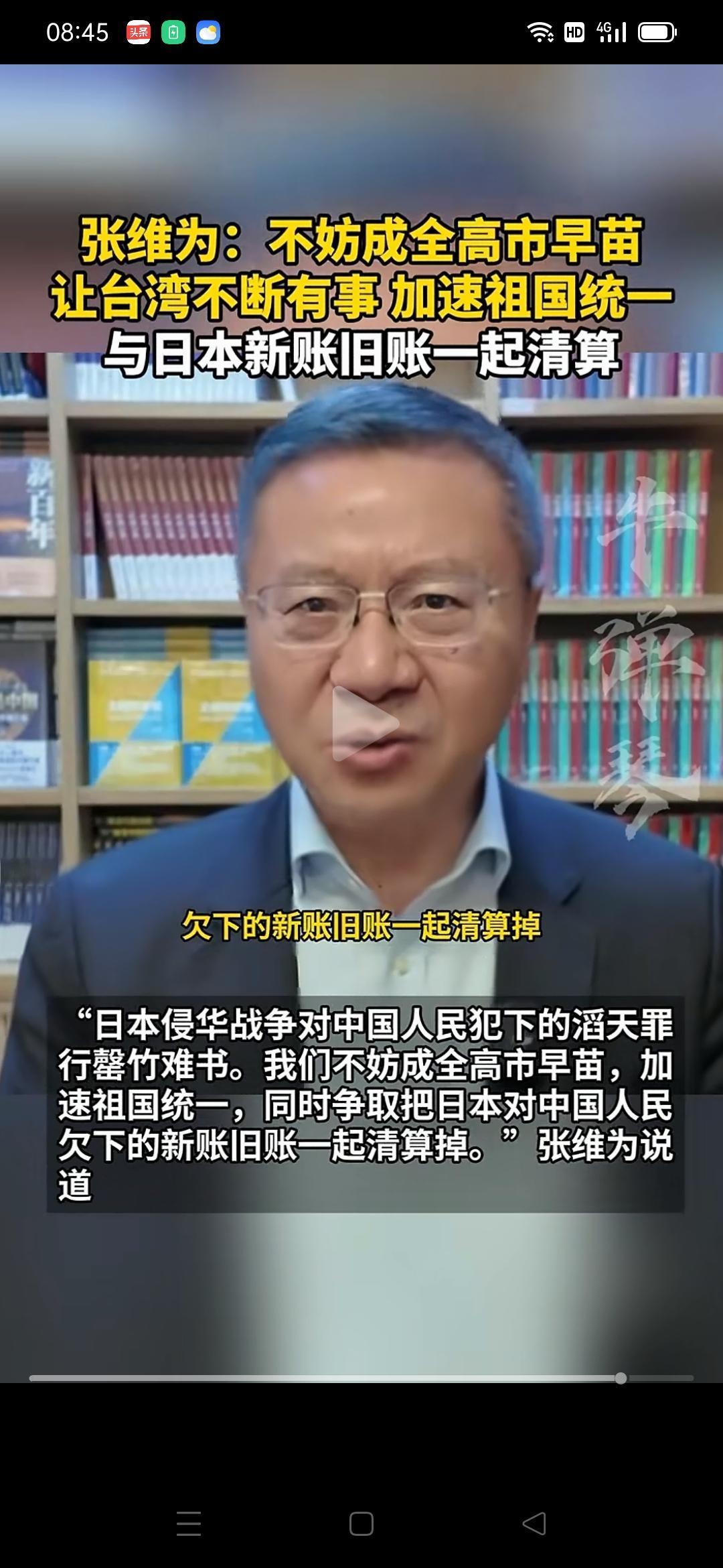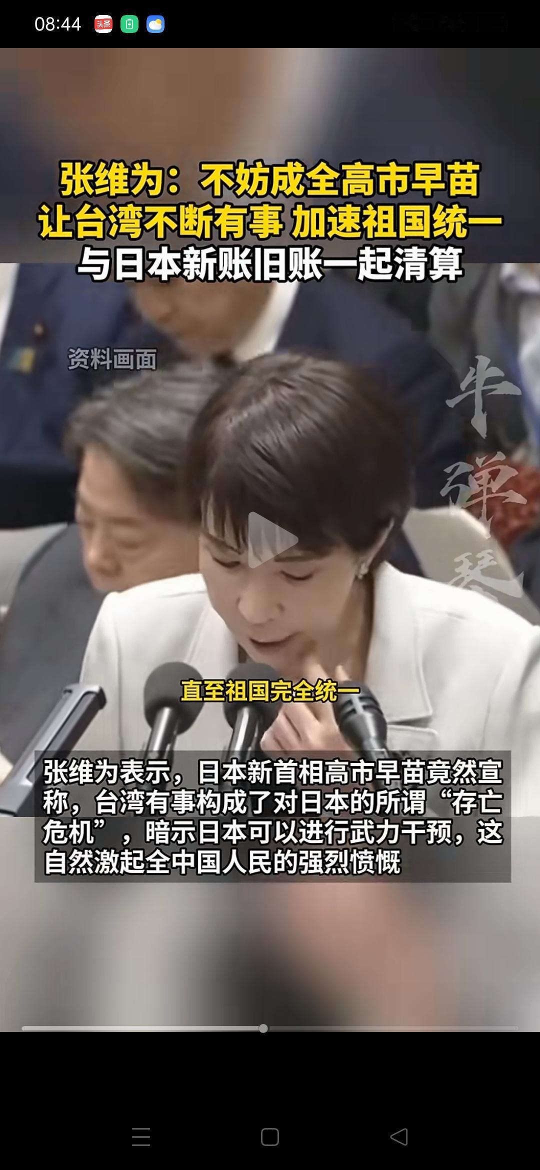 张维为教授与众不同,他说,“我们不妨成全高市早苗,加速祖国统一”。既然“台湾有事就是日本有事”,从现在起就让台湾不断有事,直至祖国完全统一。日本要武力干预,我们就旧账新账一起算。 张教授高明,我们不能因为高市的言论而生气,要顺势而为,加速两岸统一。我们一步一步推进两岸统一,看看日本能不能一步一步跟上,就希望高市早苗说话算数,紧跟不放,最后,台独势力和日本一起灭亡。“感谢”高市早苗,你为中国两岸统一立下“汗马功劳”! 高市早苗内阁 日本涉台战略 周锡玮论台湾 日本国内对高市早苗的支持率如何