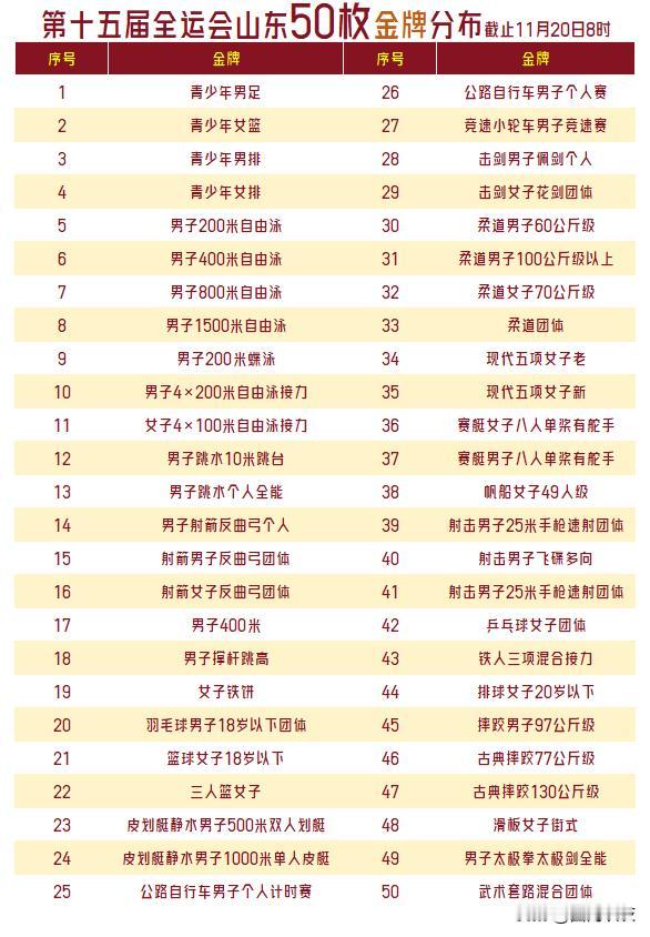 【50金49银36铜领跑!山东代表团15届全运会50枚金牌比赛项目分布!】 截止11月20日,山东代表团斩获50金49银36铜,包含去年青少年三大球4金2银。