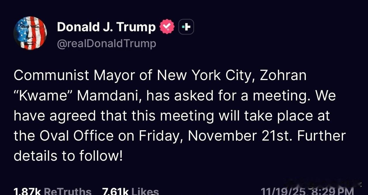 川普宣布他将于周五与纽约新任市长Zohran Mahmdani会面。 “纽约市的**主义市长Zohran "Kwame" Mamdani请求会面。 我们已同意于11月21日(星期五)在椭圆形办公室举行此次会面。 更多细节稍后公布!”