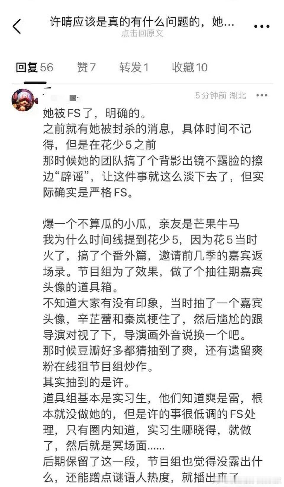 宝格丽那个活动也是几年前的视频了,近几年许晴好像没怎么出来,那时候一直说被封.杀了,还上了热.搜,后来确实也不出来了。微博上五条动态,都是关于话剧的,是因为什么被.封了啊?