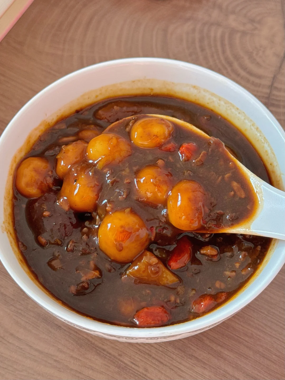 玉灵膏是关键,配料只有龙眼肉和西洋参,平时犯懒也可以干吃,微苦但有龙眼的回甘,搭配南瓜小圆子的糯叽叽口感,既能当早餐也能做下午茶,一口下去从胃暖到脚尖,也很适合姨妈前后去吃