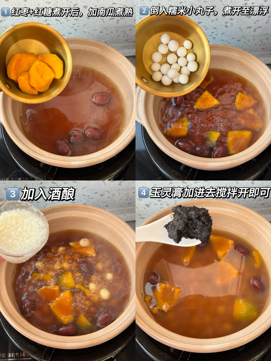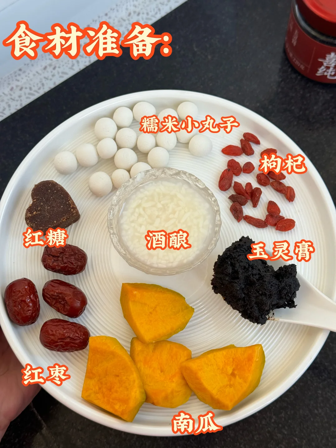 南瓜100g,糯米小丸子100g,酒酿50g,玉灵膏1勺,红枣4个(去核),枸杞适量