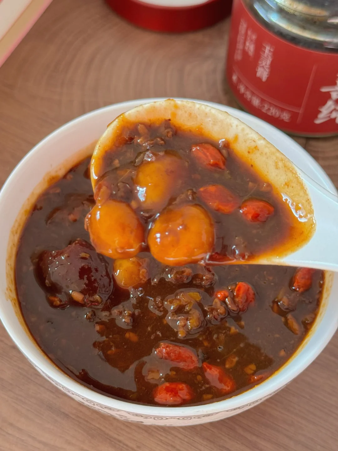 2⃣倒入酒酿和玉灵膏搅拌煮开,开锅后放入枸杞即可