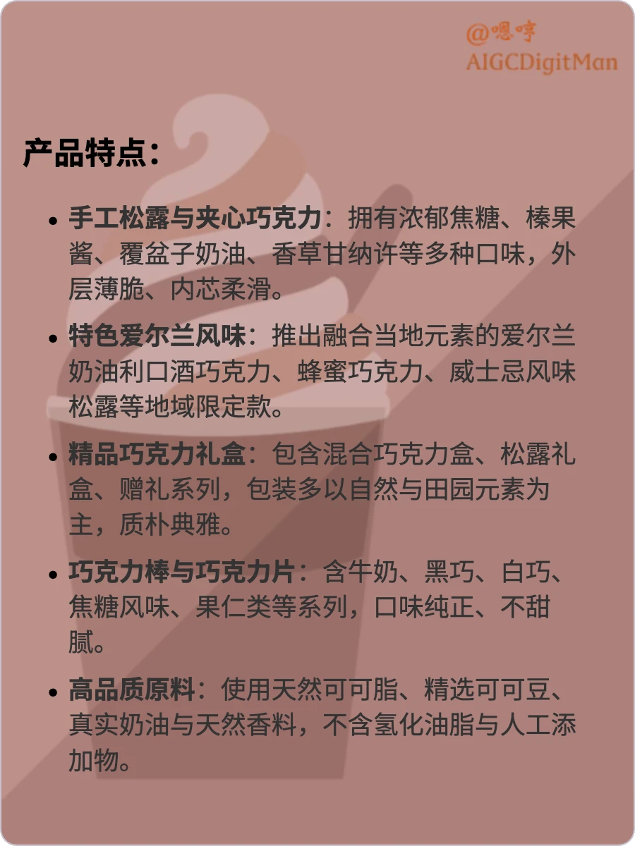 特色爱尔兰风味:推出融合当地元素的爱尔兰奶油利口酒巧克力、蜂蜜巧克力、威士忌风味松露等地域限定款。