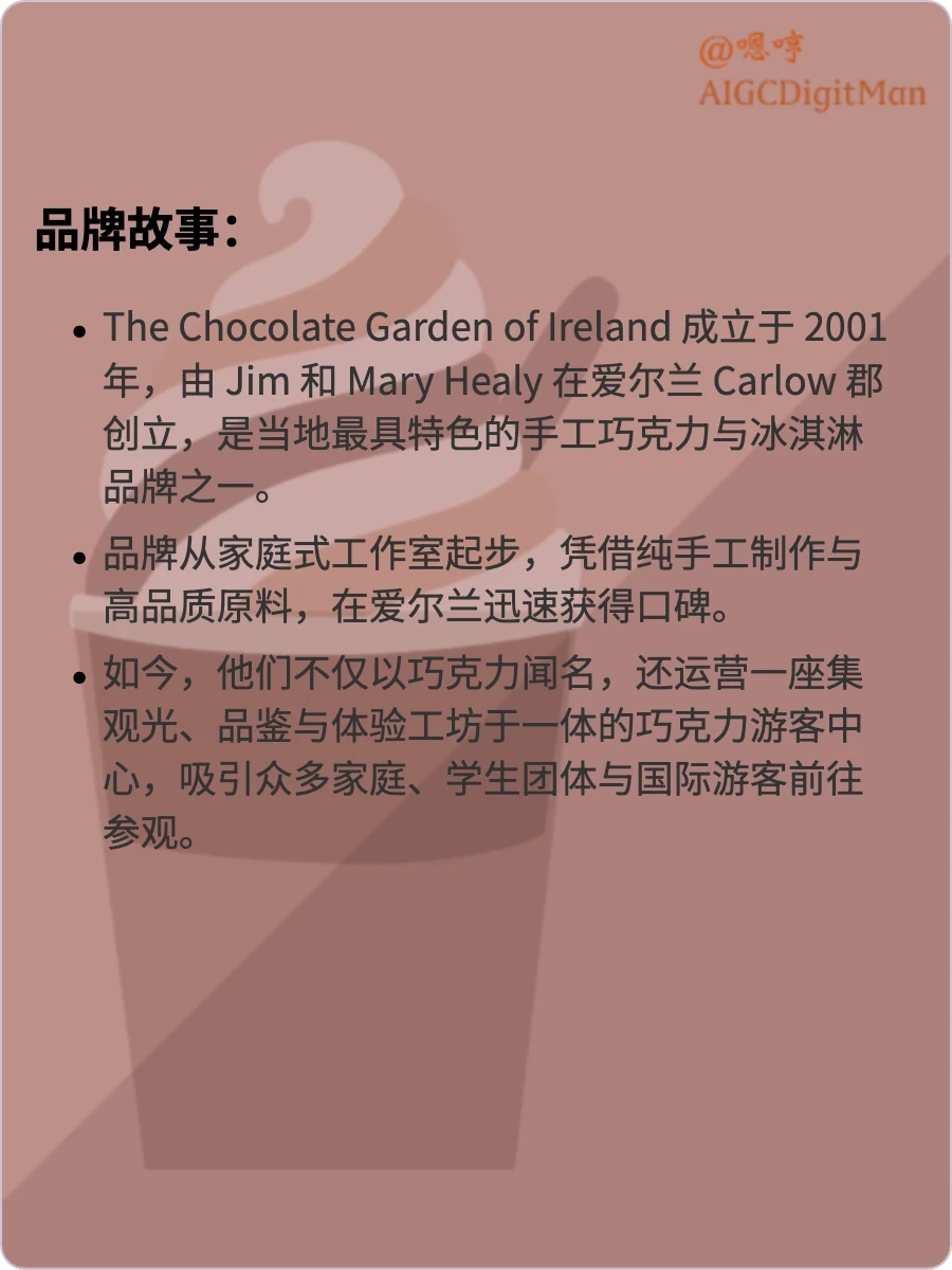 The Chocolate Garden of Ireland 成立于 2001 年,由 Jim 和 Mary Healy 在爱尔兰 Carlow 郡创立,是当地最具特色的手工巧克力与冰淇淋品牌之一。