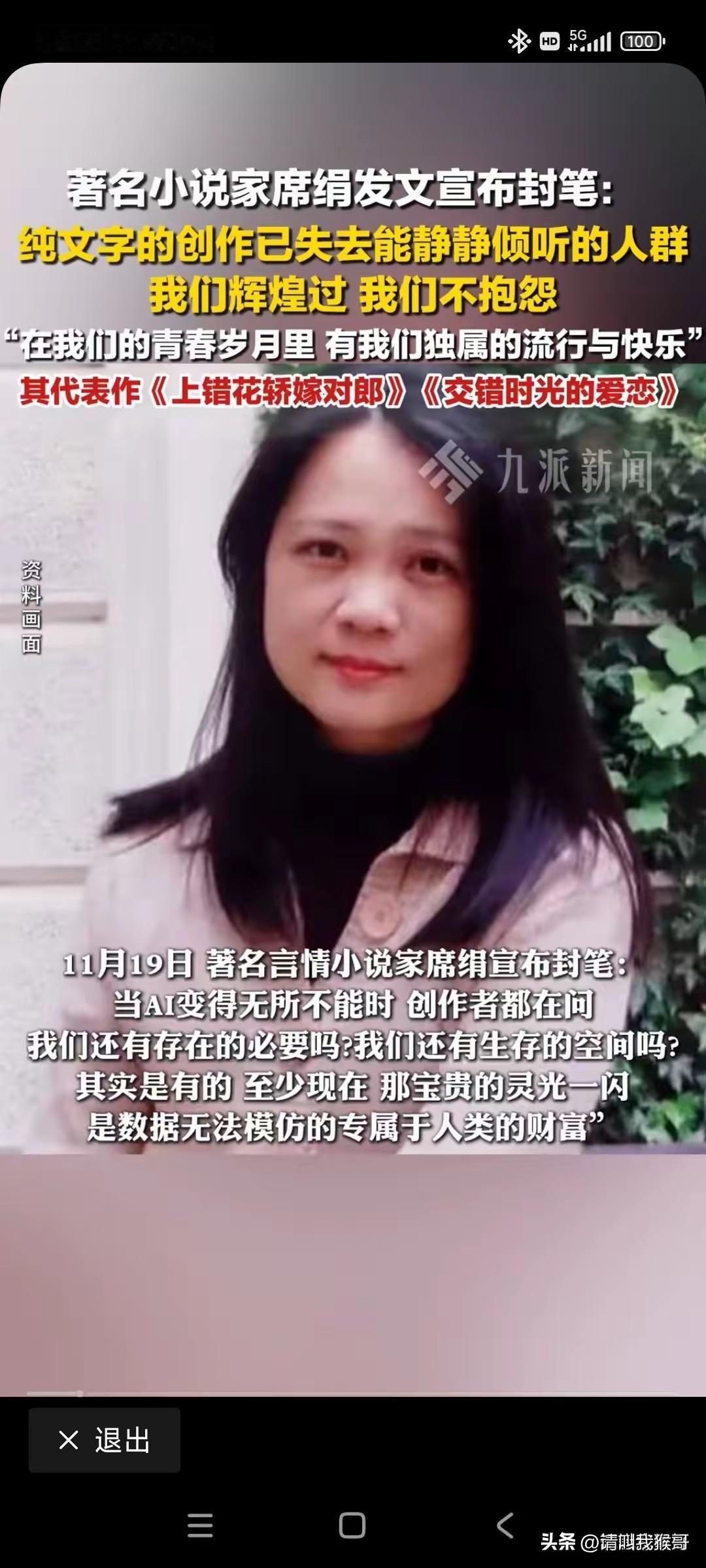 在短视频和人工智能的冲击下,纯文字创作真要被拍在沙滩上吗?近日著名小说家席绢发文封笔,引发了大家的关注。短视频靠直观画面和动感音乐抓人眼球,人工智能也能快速产出文本。虽然纯文字创作有它独特的魅力,它能让读者在字里行间展开无尽想象。像席绢、路遥、金庸等小说大家,用细腻文字勾勒出浪漫爱情、淳朴的农村和刀光剑影的江湖,曾经让无数人沉浸其中。不可否认,文字是有温度的,它能承载作者的情感与思想。但随着时代的发展,纯文字创作也许真的会退出历史舞台,在时代浪潮中它似乎已经无法坚守自己的阵地了。