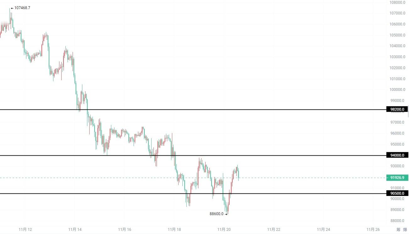 大家下午好,简单聊下今天行情看法。现在已经能明显看到回落,午后估计就在91500左右小震荡。今晚重点看94000这个强压力位——要是能突破,大饼大概率接着往上走。想做空的朋友盯紧90500的支撑:要是这位置破了,肯定得往下探更低。我个人一直觉得能到87500附近。