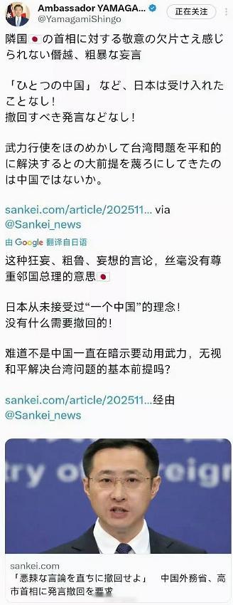 因为日本首相高市早苗的恶意挑衅,中国近期已经郑重进行了很多严厉的警告,程度仅次于“勿谓言之不预”那种。但日本方面不仅没有丝毫收敛,还更加的放肆了。11月13日,日本前驻澳大利亚大使山上信吾在2025年11月13日公开表示,日本从未接受“一个中国”原则,因此高市早苗的发言无需撤回。