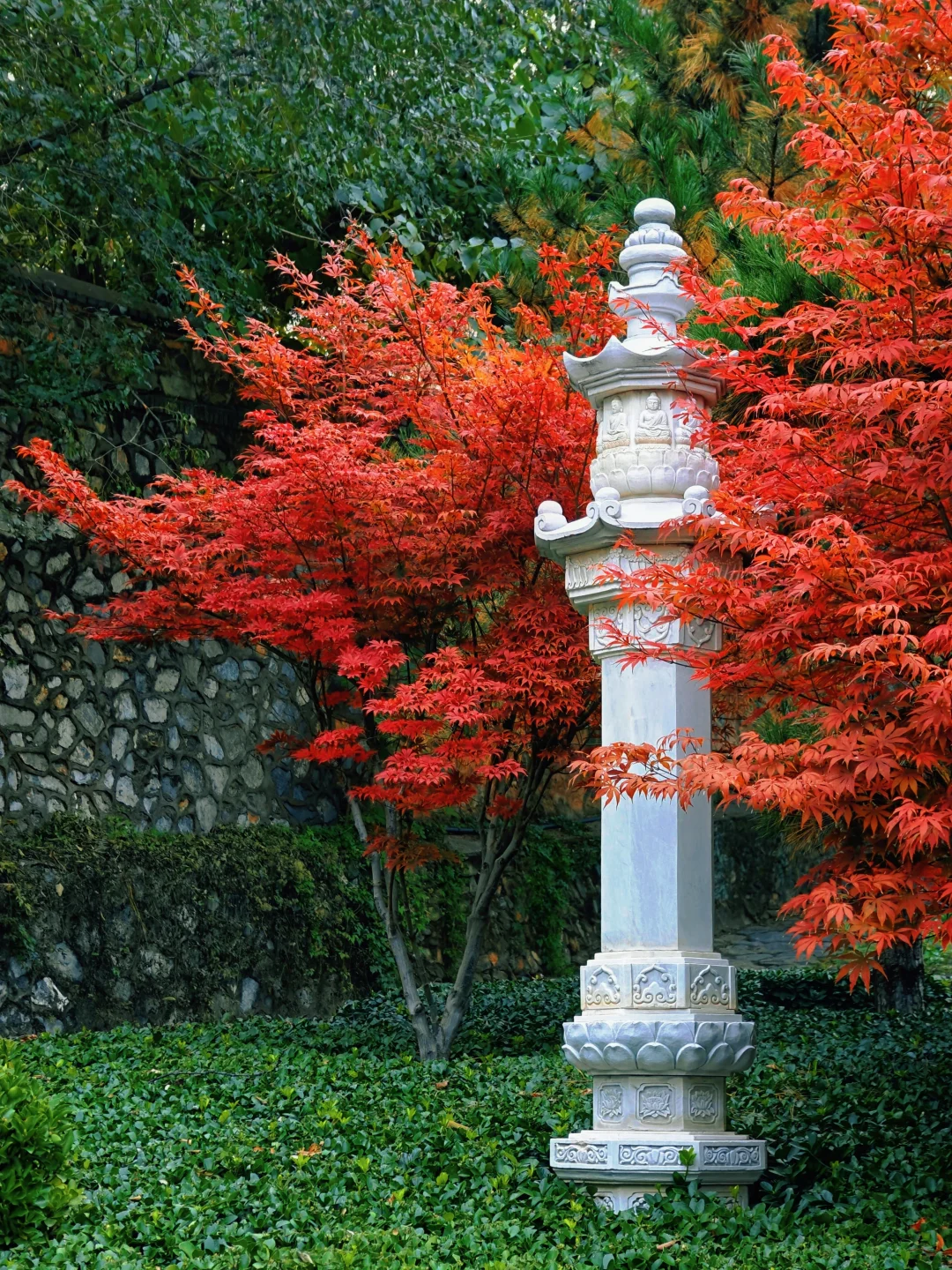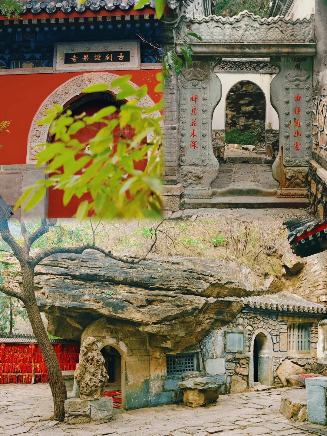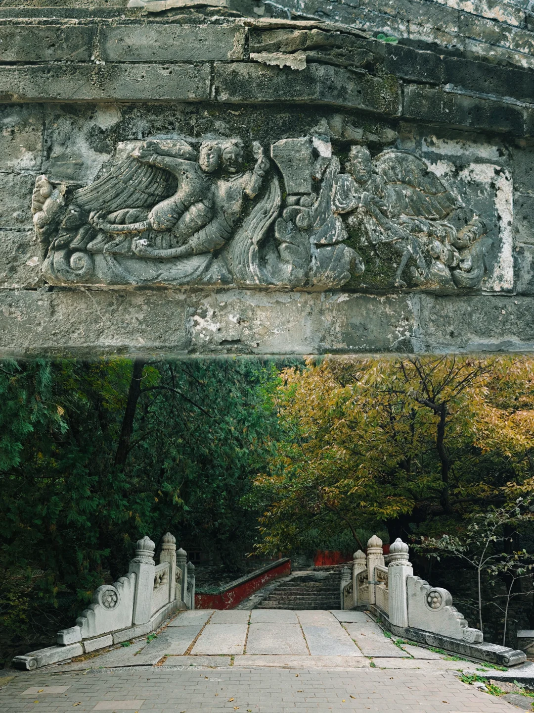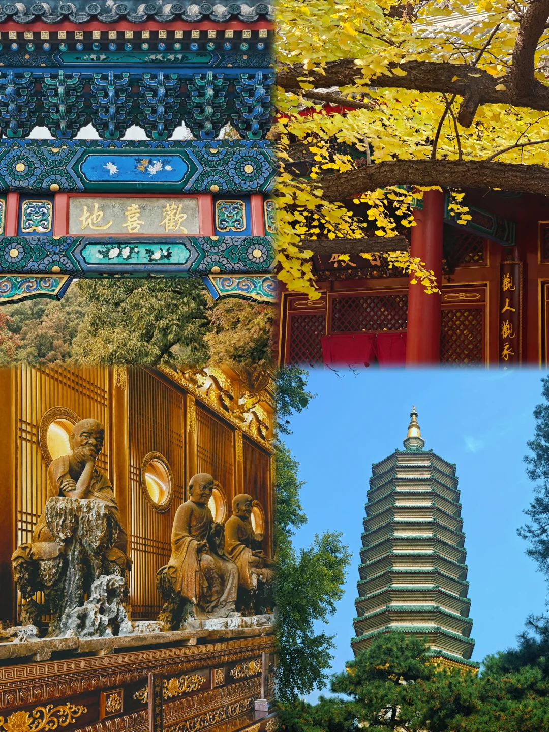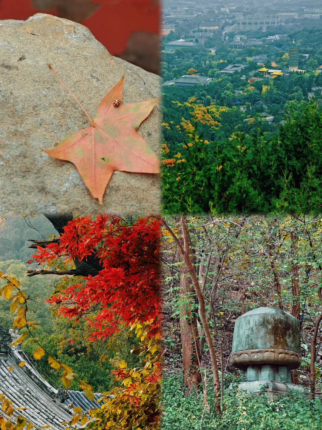 工作日人不多,大概都去隔壁香山了,游览体验很好,古树很多,推荐! 📅10.30 🚕打车定位:君福楼,车只能开到这,下车走两步就是南门 🍁走的常规路线,元宝枫红叶基本没有,黄连木半红,黄栌叶子介于黄与不黄之间。精印谷干涸状态,没人走,走下去有点探险的感觉;体力原因没有走红叶观赏区,或许那里红叶进度更好 🌡️在北京呆的几天天气不错,除了第一天🌫️很大,后面都是蓝天,白天气温挺高的,晚上也没有冷到受不了,一件薄外套足够 🍜来到三处正好是中午,就在翠薇茶社(和三山庵是通的)吃了素面,吃的打卤面,说实话太咸了,价格偏贵,自制凉菜8块钱也一般,不推荐 🚶路线:灵光寺 → 三山庵 → 大悲寺 → 龙泉庵 → 香界寺 → 宝珠洞,回到山下再爬另一个山头的证果寺 👀对于年轻人可能只需2-3小时,对于慢慢爬细细看的我来说半天有点赶,早上10点半入园,5点出来,摩崖石刻还是没来得及去看(天已经有点暗,并且去的路上比较荒凉,也没有其他游客,就没有深入),清凉寺和鬼笑石也略过了 📷初次去必打卡 2⃣️处 | 敕建灵光寺 “画像千佛塔”辽代招仙塔塔基与现代新修佛牙舍利塔,各绕3圈 3⃣️处 | 三山庵 正殿门囗水云石 4⃣️处 | 敕建大悲寺 相传元代著名雕塑家刘元作品十八罗汉 🌟大悲殿前两株古银杏树已全黄,超出片! 5⃣️处 | 龙泉庵 从上院往下看方池 ⚠️泉眼锁起来了,是不能自己接水喝的 6⃣️处 | 敕建香界寺 形态特别的卧龙松,两株七叶树 门口有冰川漂砾和四照谷桥 7⃣️处 | 宝珠洞 牌楼上乾隆御笔“欢喜地”和“坚固林”,洞内原有“鬼王菩萨”海岫禅师肉身,如今是现代玉雕代替,注意观察洞内研石如珠 传说甚多,八卦比景点更有意思 出南角门可登临平坡山顶远眺京城景色 8⃣️处 | 敕建证果寺 京城蕞古老寺院之一 走入“曲径通幽处,禅房花木深”,通向招止亭和秘魔崖 600年古黄连木 阿耨达流(已干涸) 东侧路旁有一造型奇特的和尚墓塔 ℹ️公园信息 北京八大处公园 📍石景山区西山风景区南麓 翠微山、平坡山、卢师山三山环抱,形似座椅,八座古刹星罗棋布,自然天成“十二景” 🎫10 ⏰06:00开,11/15前18:00关,11/16起17:30关 ⚠️索道和滑道修缮中不开放,想速通下山🙅