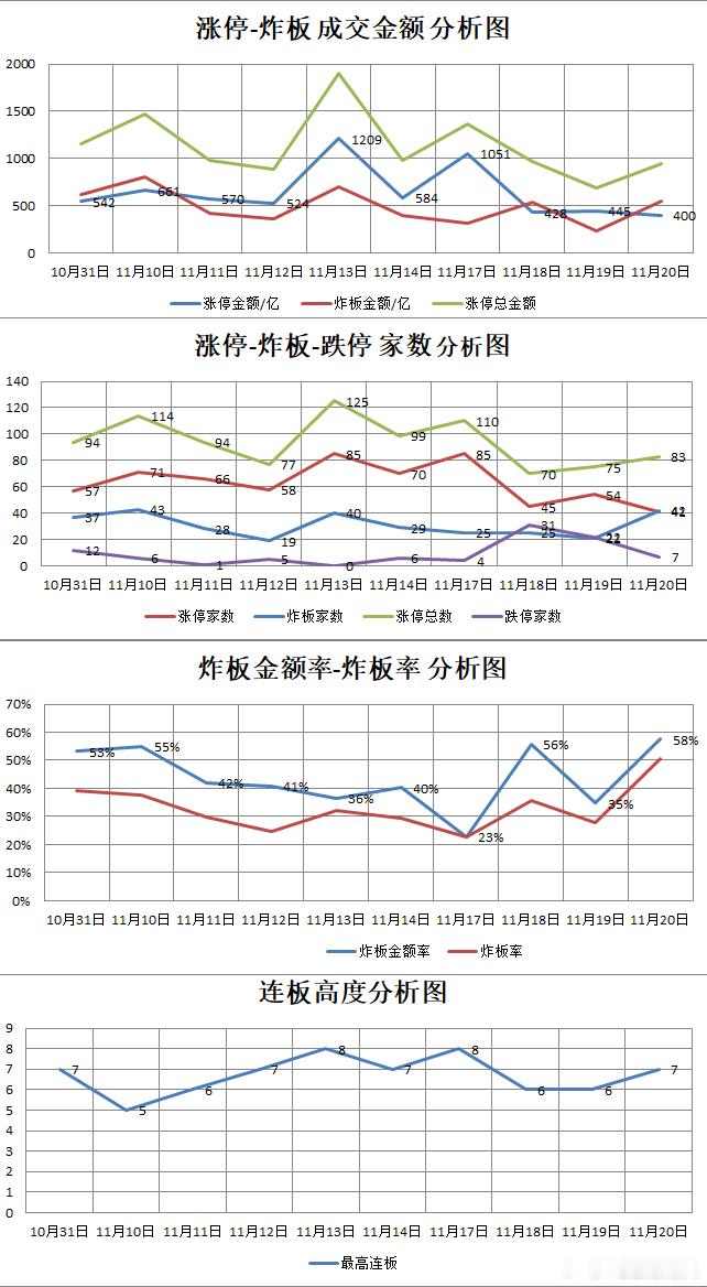 【11.20星期四】 湖南人涨停复盘 "涨停金额:400亿 炸板金额:542亿首板金额:221亿 连板金额:179亿涨停41家 炸板42家 跌停7家首板29家 连板12家" 【市场连板股】12只 179亿 代码 名称 末次时间 连板数 原因601566 九牧王 14:43 7 福建000798 中水渔业 14:18 5 水产000547 航天发展 14:52 5 福建002474 榕基软件 9:30 4 福建002213 大为股份 9:50 3 锂电池002877 智能自控 15:00 3 高端阀门603216 梦天家居 9:25 2 公告601279 英利汽车 9:30 2 福建000017 深中华A 9:32 2 锂电池000859 国风新材 9:33 2 半导体001390 古麒绒材 13:57 2 消费000663 永安林业 14:56 2 福建【福建】9只 177亿 消息面:人民日报:台湾光复昭示祖国必定统一 601566 九牧王 14:43 7 男裤(福建)000547 航天发展 14:52 5 军工(福建)002474 榕基软件 9:30 4 AI政务(福建)601279 英利汽车 9:30 2/5天3板 海峡两岸000663 永安林业 14:56 2/4天3板 森林资源(福建)002235 安妮股份 10:04 1 IP版权(福建)000536 华映科技 10:26 1 福建600734 实达集团 11:12 1 福建603122 合富中国 13:41 1/18天13板 海峡两岸双上市【锂电池】7只 50亿 消息面:碳酸锂期货强势突破10万元大关;VC等电解液添加剂价格连续大涨 002213 大为股份 9:50 3 锂精矿000017 深中华A 9:32 2 黄金珠宝+锂电池300774 倍杰特 9:33 1 收购大豪矿业55%股权002753 永东股份 9:45 1 锂电池负极材料301092 争光股份 10:05 1 盐湖提锂树脂002455 百川股份 10:28 1 磷酸铁锂603978 深圳新星 14:44 1 六氟磷酸锂【人工智能】5只 47亿 601208 东材科技 13:38 1 高速树脂(M9)+PCB300814 中富电路 13:48 1 服务器电源(三次电源)603803 瑞斯康达 14:04 1 传华为容器云002141 贤丰控股 14:23 1 覆铜板600996 贵广网络 14:49 1 算力【半导体】3只 39亿 000859 国风新材 9:33 2 聚酰亚胺(PI)薄膜600635 大众公用 10:41 1 间接持股摩尔线程002175 东方智造 10:43 1 弘皋半导体注入猜想【证券相关】3只 8亿 600826 兰生股份 9:41 1 持有海通证券600191 华资实业 9:44 1 参股券商600881 亚泰集团 10:34 1 券商整合预期【其他热点】 603216 梦天家居 9:25 2 溢价转让股权002331 皖通科技 9:34 1 实控人认购定增000838 财信发展 13:01 1 地产603898 好莱客 13:05 1 地产603657 春光科技 10:01 1 机器人002369 卓翼科技 11:08 1 机器人002246 北化股份 9:35 1 军工600343 航天动力 13:52 1 军工001390 古麒绒材 13:57 2 消费002836 新宏泽 14:35 1/3天2板 消费【其他个股】 002877 智能自控 15:00 3 高端阀门002205 国统股份 9:57 1/4天2板 名字概念000798 中水渔业 14:18 5 水产000566 海南海药 10:46 1/5天3板 医药【涨停炸板】42只 542亿 代码 名称 首次时间 涨跌幅 原因301172 君逸数码 11:02 14.27% 公告300295 三六五网 11:26 9.89% 地产000417 合百集团 10:17 9.22% 半导体603092 德力佳 10:30 8.54% 其他002476 宝莫股份 13:06 7.88% 其他600331 宏达股份 9:59 7.84% 大金融605598 上海港湾 10:16 7.34% 航天000735 罗牛山 13:09 7.27% 海南600080 金花股份 9:35 7.15% 其他605399 晨光新材 9:35 7.12% 有机硅001203 大中矿业 9:38 7.06% 锂电池002667 威领股份 10:04 6.94% 锂电池002240 盛新锂能 10:01 6.77% 锂电池000505 京粮控股 10:55 6.51% 海南600601 方正科技 9:52 6.40% PCB板603177 德创环保 14:06 6.33% 环保000560 我爱我家 11:01 6.23% 地产002285 世联行 11:22 6.10% 地产002806 华锋股份 9:30 5.59% 新能源汽车603381 永臻股份 9:56 5.57% 液冷服务器603002 宏昌电子 9:30 5.56% 人工智能002893 京能热力 10:07 5.51% 天然气002752 昇兴股份 9:31 5.31% 福建002484 江海股份 9:38 4.81% 东数西算/算力601133 柏诚股份 9:35 4.43% 国产芯片002741 光华科技 9:36 3.89% 固态电池600110 诺德股份 9:34 3.83% 人工智能002125 湘潭电化 9:54 3.80% 固态电池600367 红星发展 9:42 3.68% 固态电池000926 福星股份 11:26 3.52% 地产600965 福成股份 9:25 3.41% 消费002866 传艺科技 9:40 3.03% 钠电池002321 华英农业 9:30 2.56% 消费603181 皇马科技 9:30 2.39% 其他000695 滨海能源 9:30 1.52% 锂电池603059 倍加洁 13:12 -1.25% 消费600319 亚星化学 9:25 -3.25% 公告002086 东方海洋 9:25 -4.36% 水产600097 开创国际 9:25 -5.18% 水产000546 金圆股份 9:25 -5.26% 锂电池600756 浪潮软件 9:31 -5.58% 人工智能600280 中央商场 9:25 -9.51% 消费