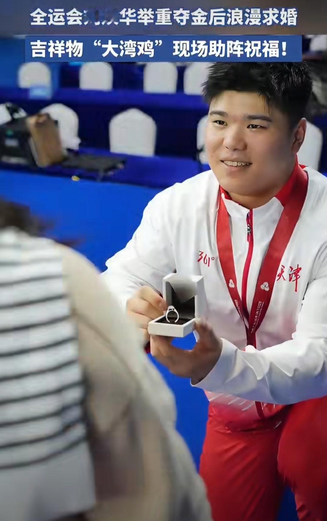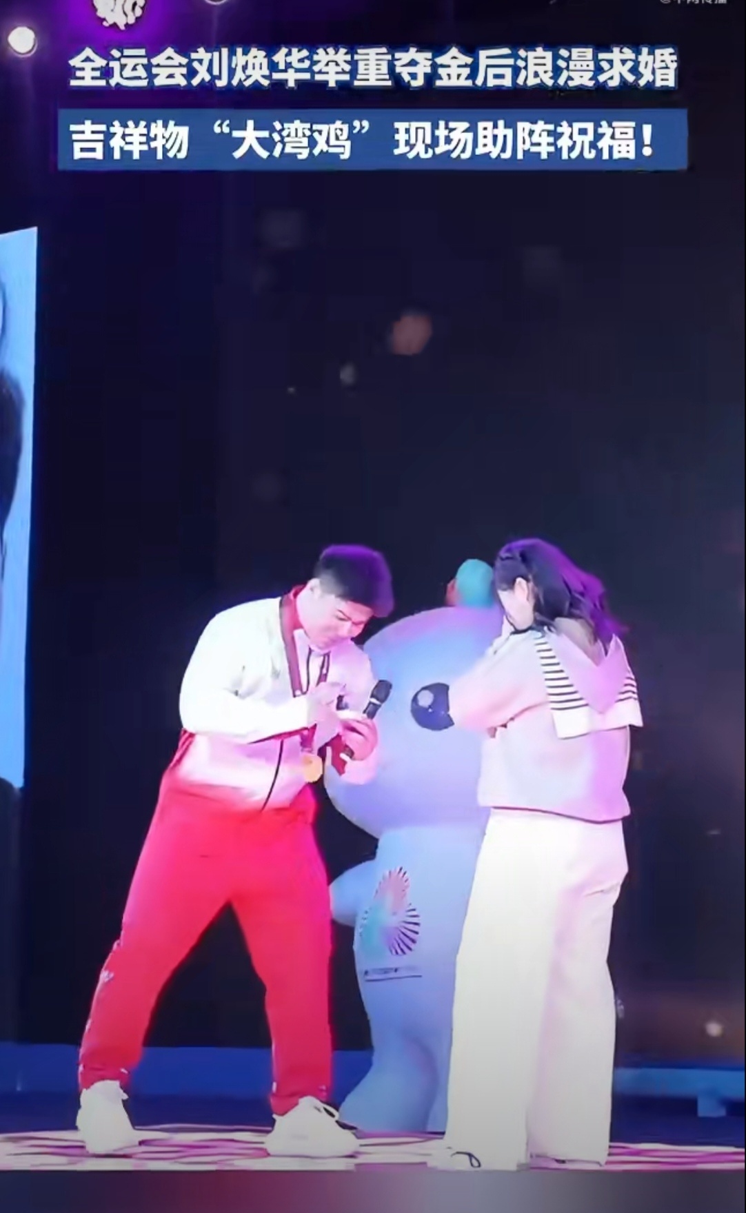 大湾鸡:这波祝福我必须抢镜!刘焕华全运会举重夺冠后,在万众瞩目下单膝跪地求婚,深情告白道尽多年陪伴的不易。两只“大湾鸡”早已在台上等候,魔性舞姿搭配满场欢呼,让这场冠军求婚仪式感拉满,幸福值直接爆表~