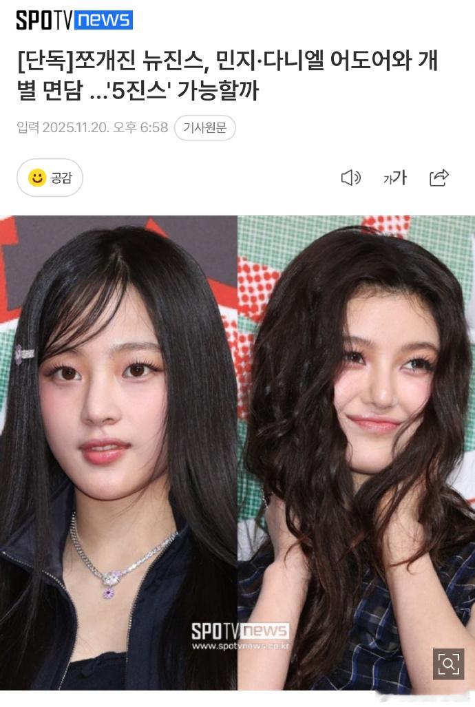 根据20日的采访消息,Minji 和 Danielle 已与 ADOR 进行了单独面谈。在单独面谈中,双方就回归所需的前提条件等相关事项共享了立场并进行了讨论。 据悉目前滞留在南极的 Hanni 还尚未参与单独面谈。