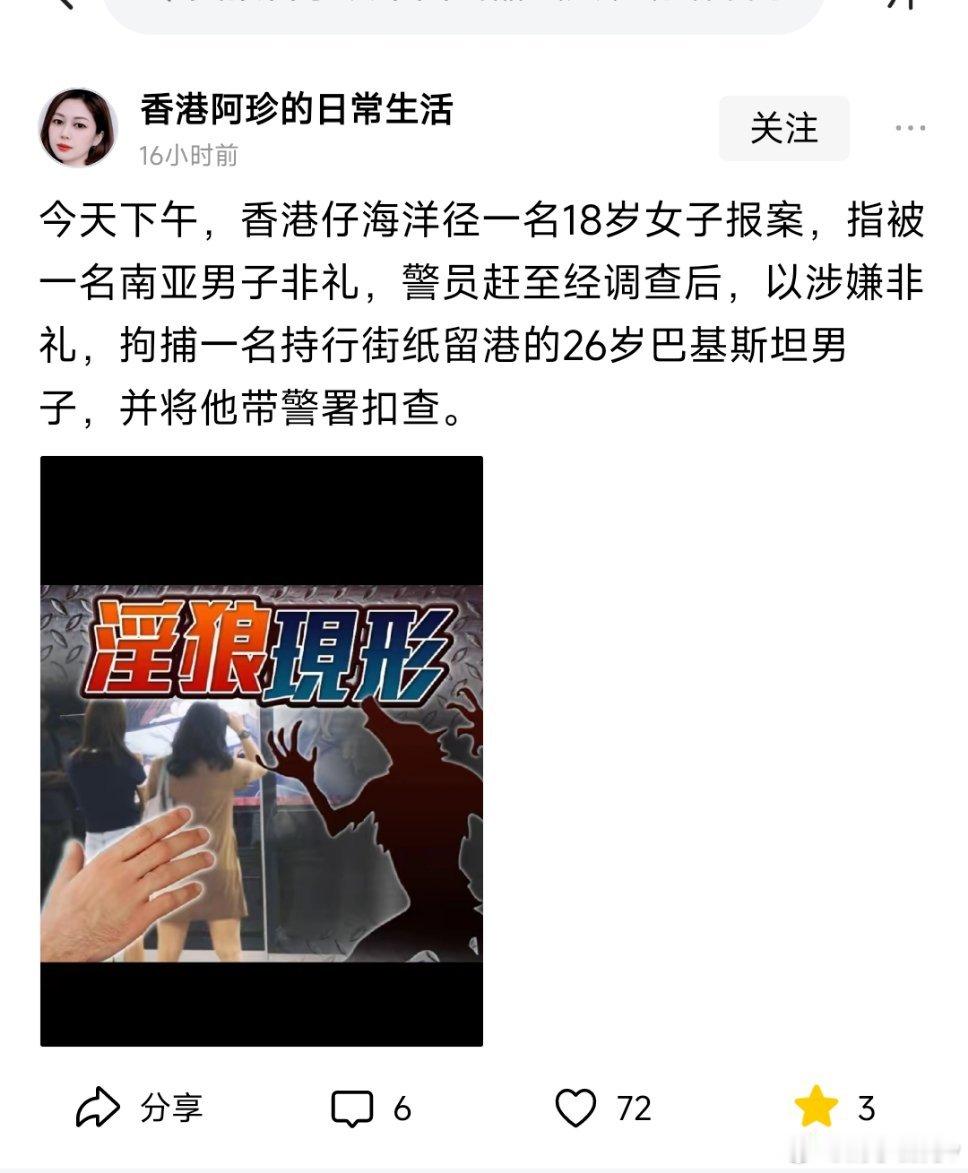 网友爆料:昨天下午,香港仔海洋径一名18岁女子报案,指被一名南亚男子猥亵,警员赶至经调查后,以涉嫌非礼,拘捕一名持行街纸留港的26岁巴基斯坦男子,并将他带警署扣查,应拘留遣返出境