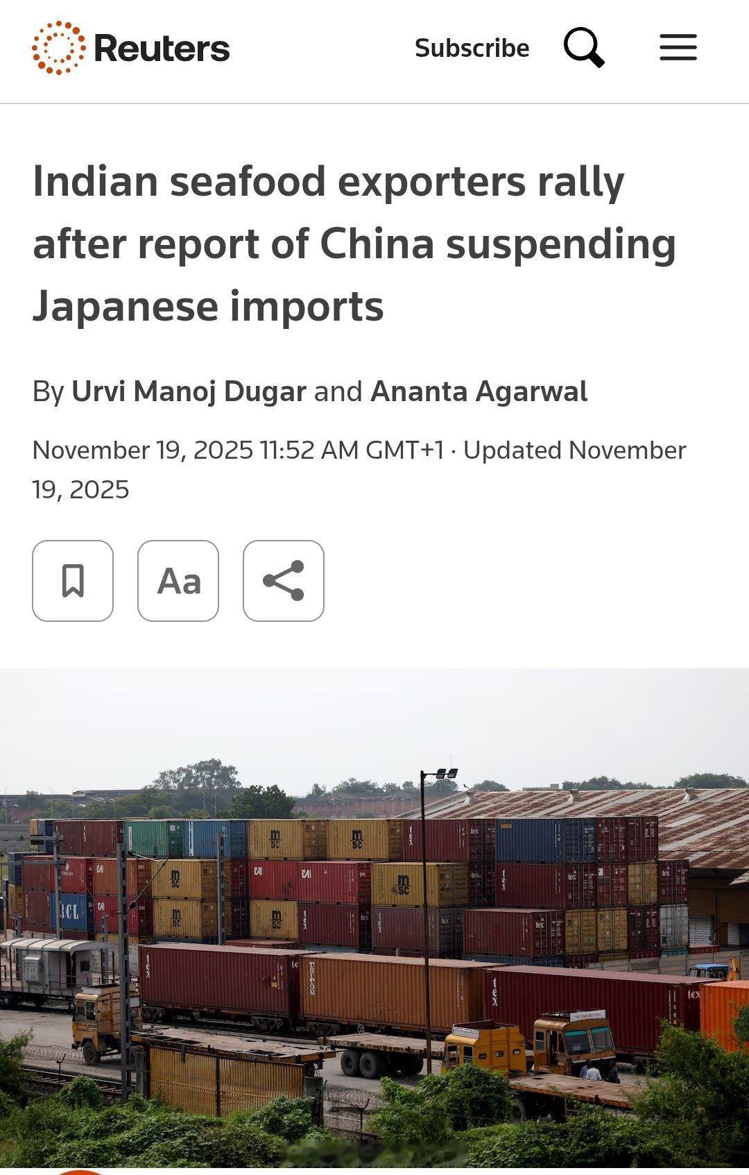11月19日(路透社)——印度海产品出口商周三一度上涨多达11%,此前有媒体报道称,中国已通知日本计划暂停从日本进口海产品。此举可能会将需求转向印度等替代供应国。北京几个月前才部分放宽对日本海产品的限制。然而,如果重新实施禁令,可能会对那些希望重新进入中国市场的日本企业造成严重打击,而中国市场曾一度占日本海产品出口的20%以上。另一方面,中国需求可能的上升,或为印度海产品出口商带来“生命线”。这些出口商正因美国——印度最大的市场——征收的高额关税而受到挤压,其客户包括沃尔玛(WMT.N)和克罗格(KR.N)等大型零售商。去年,印度的全球海产品出口总额达到74亿美元,其中虾类占比40%。Geojit Financial Services的股票研究分析师文森特·K·安德鲁斯(Vincent K Andrews)表示,由于关税问题影响出口,公司一直在寻求多元化出口市场。他补充道,任何新的机会对该行业都是利好消息。