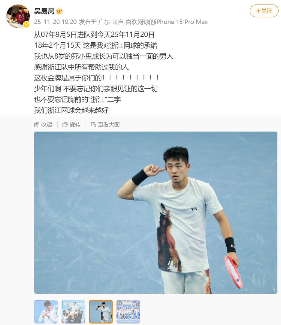 【】11月20日,第十五届全运会网球项目迎来男子单打项目的决赛,浙江队吴易昺迎战北京队的商竣程,最终吴易昺以6-0、1-6、6-4战胜对手,夺得网球男单金牌。赛后吴易昺发博,表示浙江网球会越来越好。
