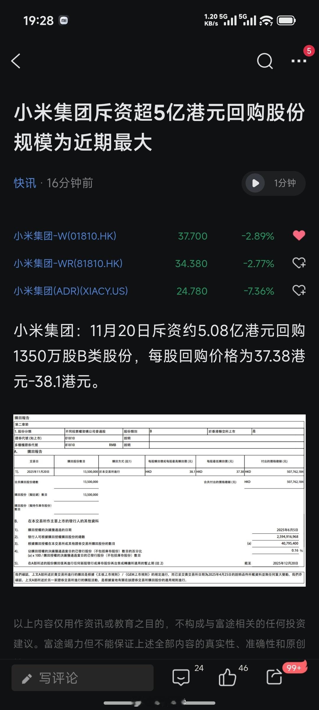 今日小米集团斥资超5亿港元回购股份,规模为近期最大