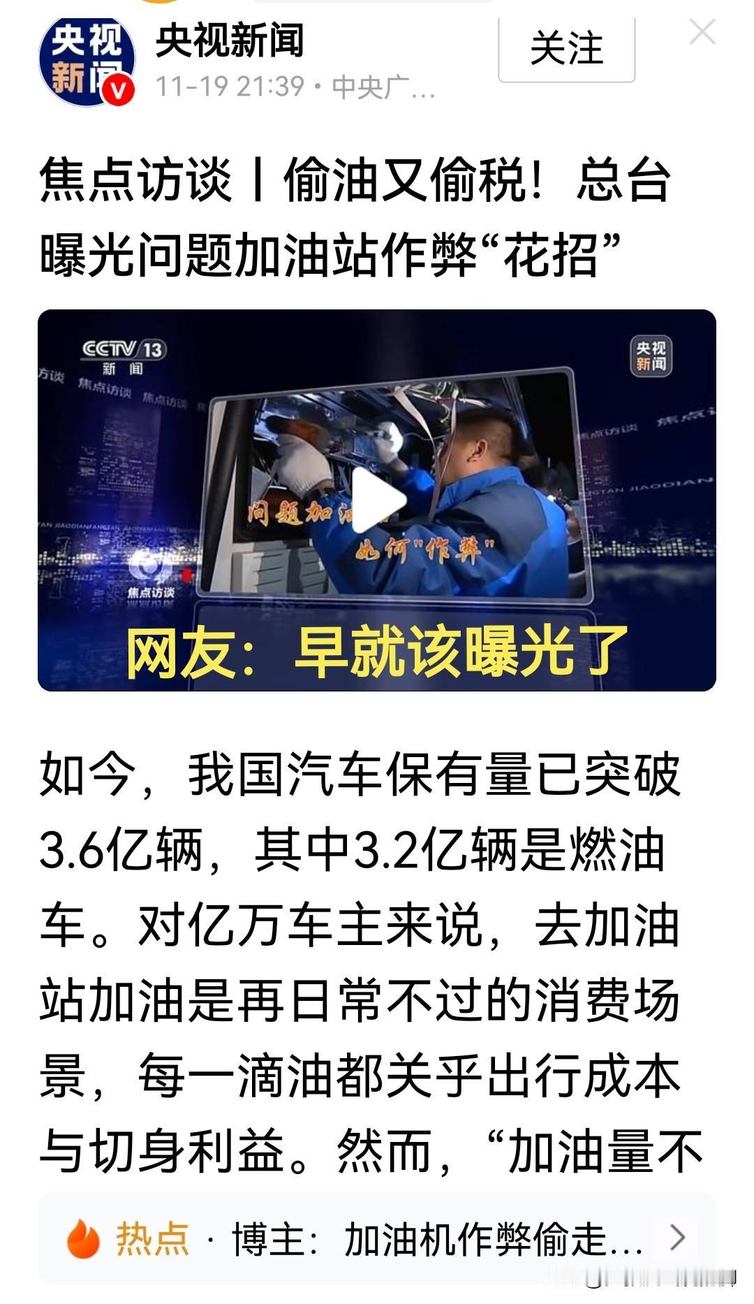 加油站⛽️偷油又偷税,这种事情还得是央视进行曝光才行。平常很多消费者也质疑过,也曝光过,但是那些不讲诚信的加油站经营者和工作人员总是不承认他们自己有问题,搞的消费者们老是吃哑巴亏。 现在央视直接对此事进行了曝光,看来是该对加油站好好进行整治和管理了,不能让他们再继续为所欲为、坑骗消费者了。 冬日生活打卡季晒图笔记大赛