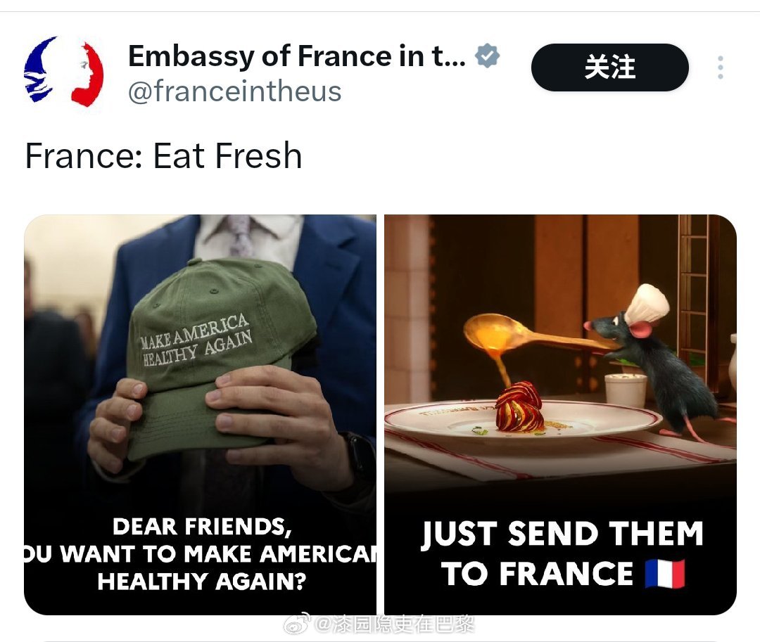 法国驻美大使馆发图:“DEAR FRIENDS, YOU WANT TO MAKE AMERICANS HEALTHY AGAIN?”➡️ “亲爱的朋友们,你们想让美国人再次健康吗?”“JUST SEND THEM TO FRANCE 🇫🇷”➡️ “把他们送到法国就行了 🇫🇷”