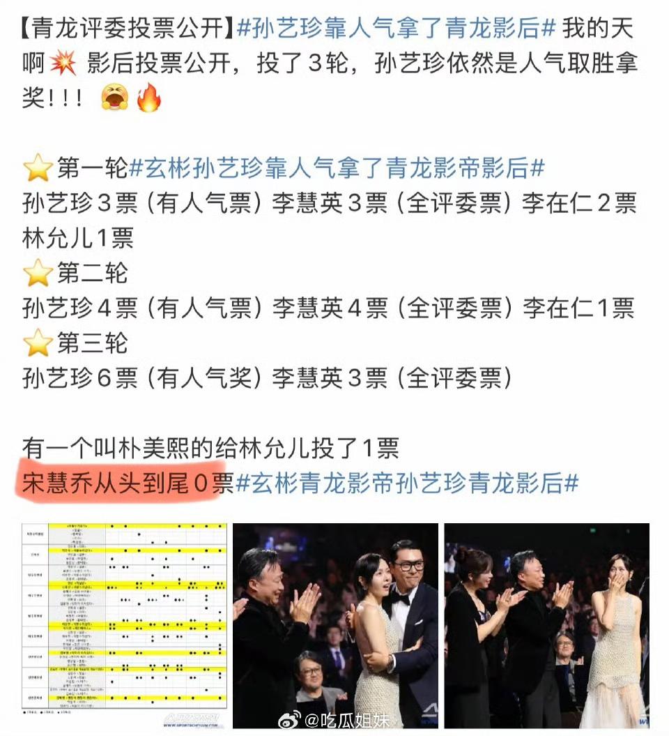 昨晚的青龙奖,宋慧乔应该是全场最煎熬的女明星了。 因为这一次,她真的纯纯是陪跑。 青龙奖评委票数公布,孙艺珍三轮票数分别是3、4、6,而宋慧乔居然三轮都是0票。 别人都有个1票2票的,顶流女明星宋慧乔居然都是0票,数据真不是一般的难看。 而且今年青龙奖,玄彬和孙艺珍夫妻两人双双领奖,同台秀恩爱。 要知道,玄彬是宋慧乔的前任啊!孙艺珍 宋慧乔 所以,主持公布孙艺珍拿奖的时候,宋慧乔连装都不装了。 不能秀恩爱,那奖也不能给宋慧乔一个吗?不给奖,也不要全部0票吧? 宋慧乔在中国这么受欢迎,难道在韩国被针对了吗?