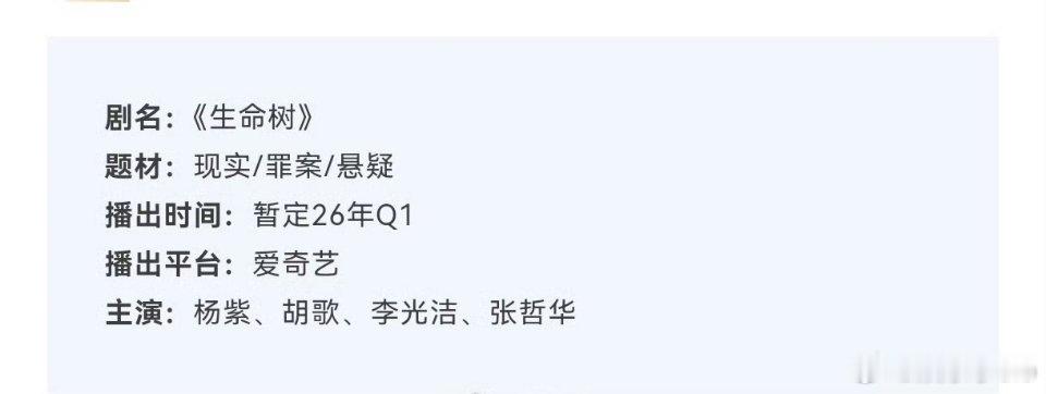 杨紫、胡歌、李光洁、张哲华主演的《生命树》播前招商,预计明年Q1播出,白菊警官等你好久了