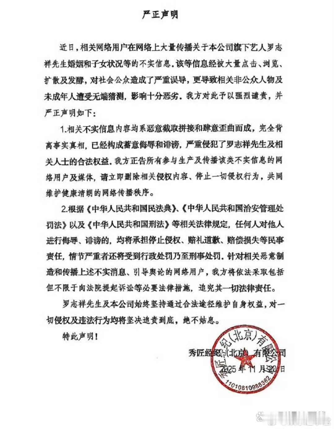 罗志祥工作室发声明称:相关用户在网络大量传播关于罗志祥先生婚姻和子女状况等不实信息,相关不实信息内容均系恶意截取拼接和肆意歪曲而成,完全背离事实真相,工作室已进行集中取证。