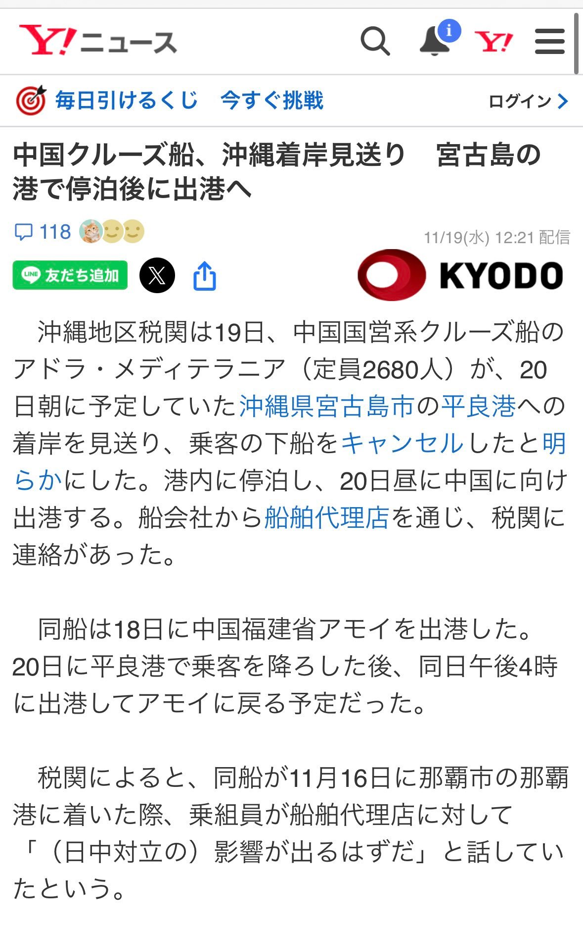 冲绳地区海关 19日透露,中国邮轮爱达·地中海号(定员2680人),原定于20日早上抵达冲绳县宫古岛市平良港,中方通知取消了所有乘客的下船。邮轮将港口内稍作打卡停留,中午直接返回中国。
