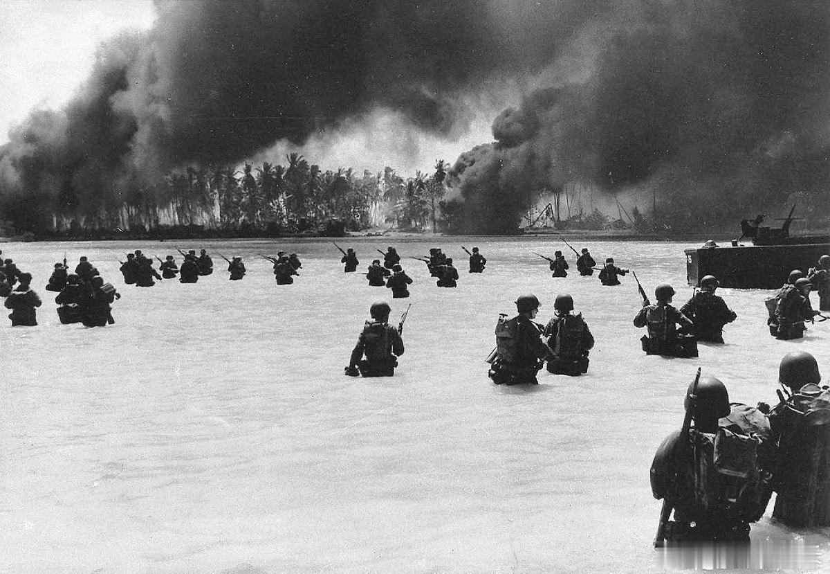 1943年11月20日,美军第165步兵团第2营的士兵在吉尔伯特群岛马金环礁的布塔里塔里岛(Butaritari)“黄二滩”(Yellow Beach Two)涉水登陆。由于登陆艇在浅水区搁浅,他们不得不在日军火力下徒步约230米上岸,最终于中午前夺取了滩头。