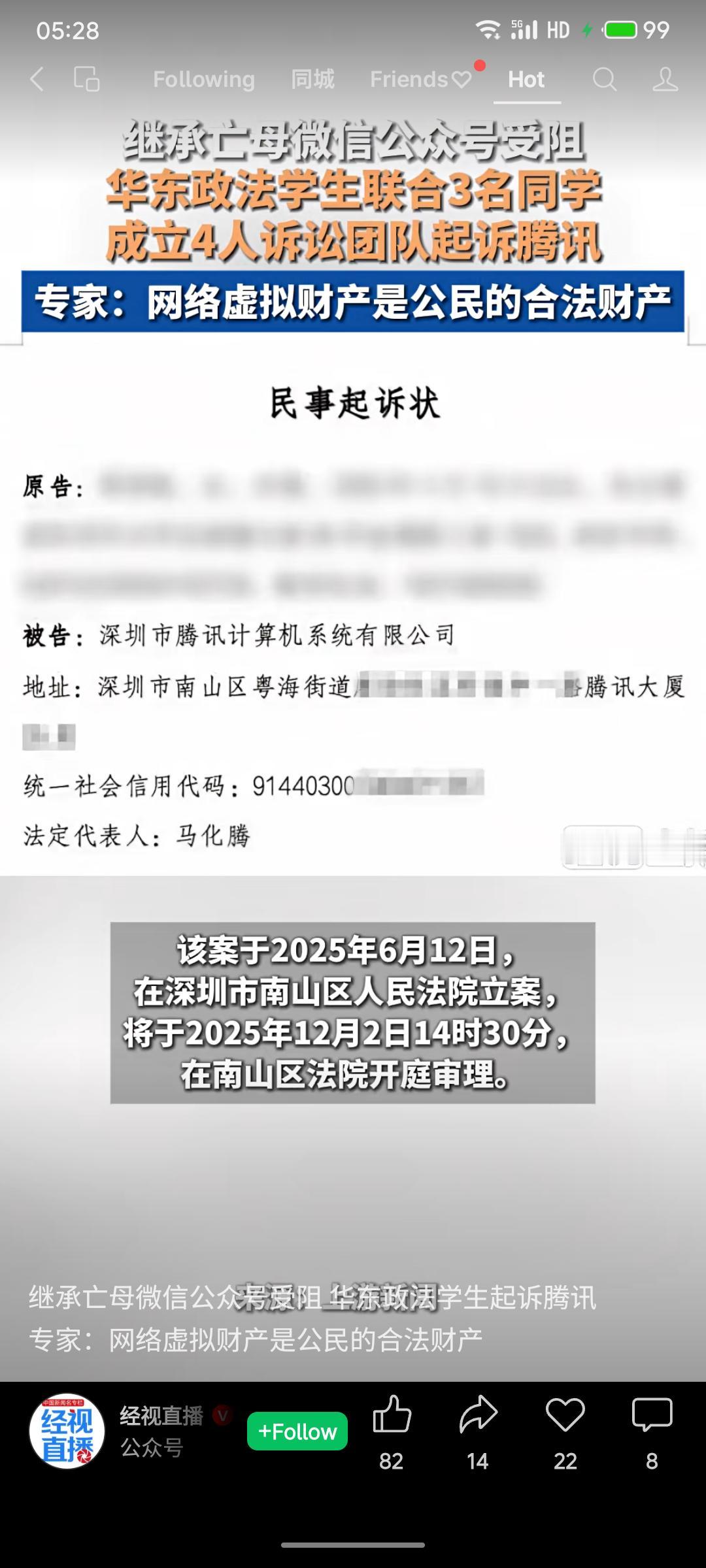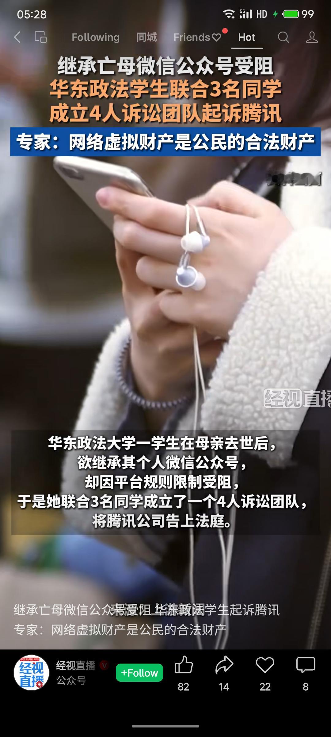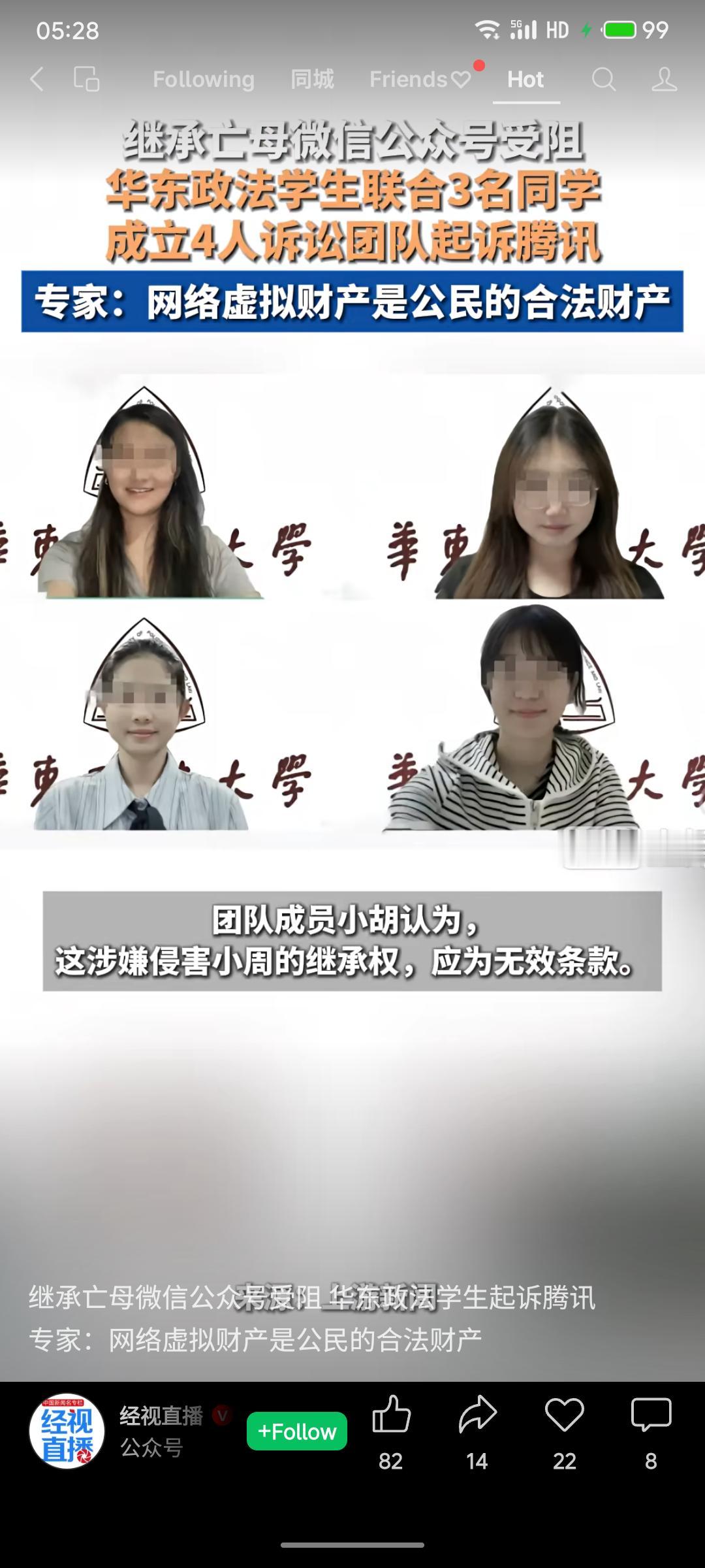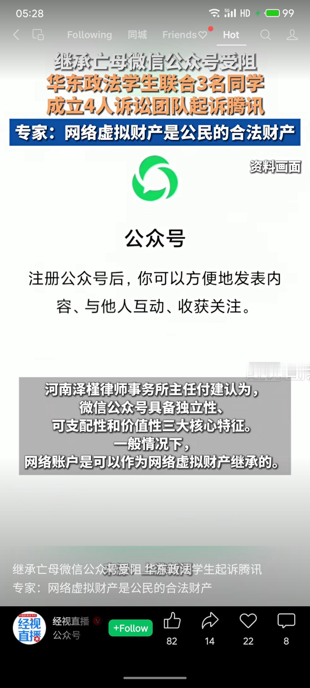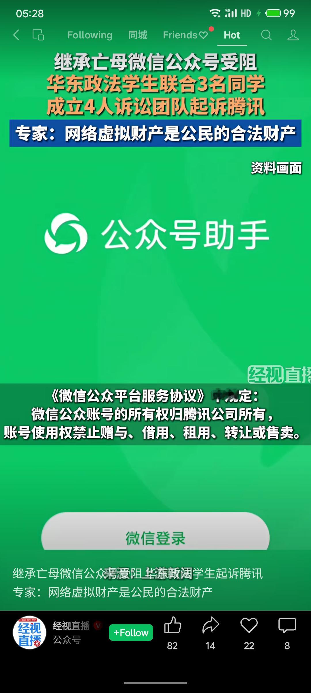 华东政法大学一名学生在母亲去世后,希望继承其生前使用的微信公众号,但因腾讯《微信公众号服务协议》中明确规定账号使用权禁止转让或继承而受阻。该生遂与三名同学组成诉讼团队起诉腾讯,主张网络虚拟财产应属合法财产,相关条款涉嫌侵害继承权。法律专家认为公众号具备财产属性,通常应可继承。