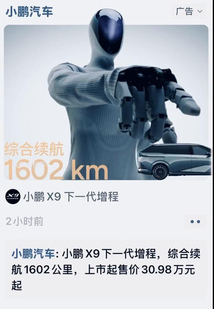 小鹏汽车:小鹏X9下一代增程,综合续航1602公里,上市起售价30.98万元,全球续航超长大七座。