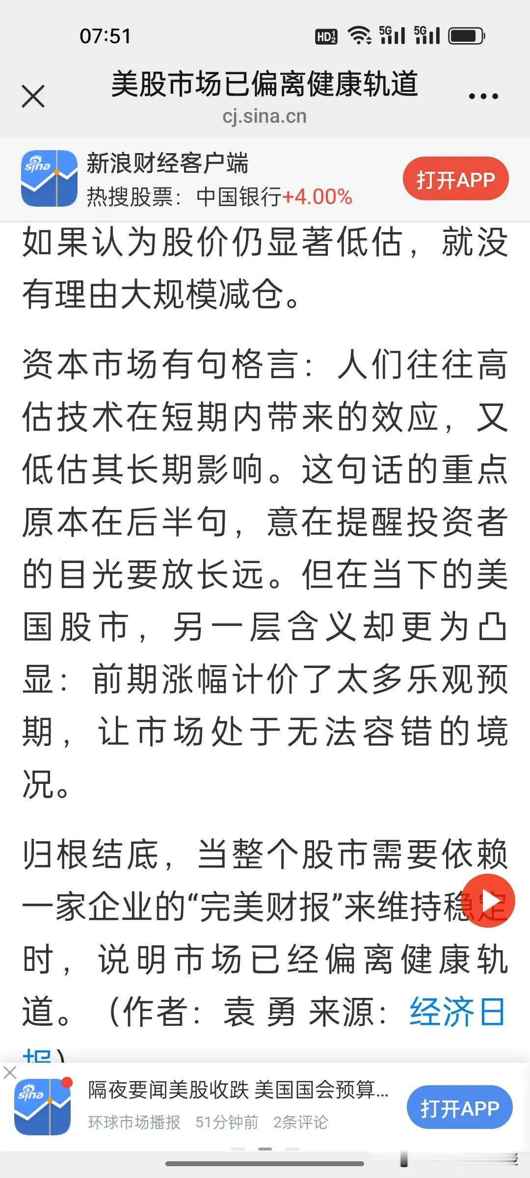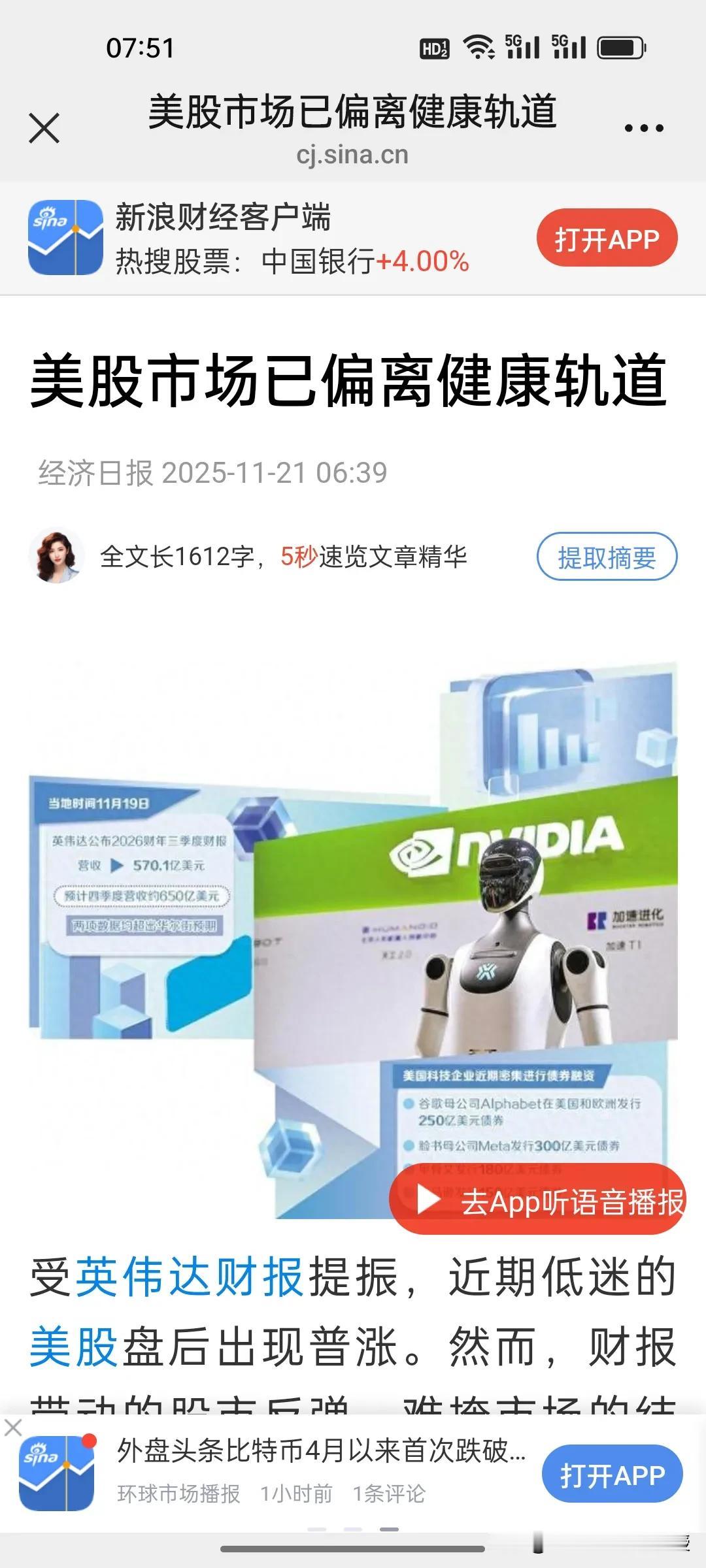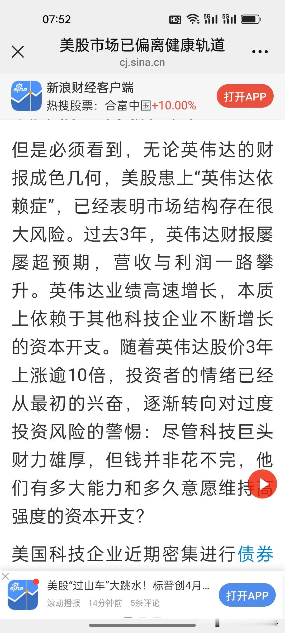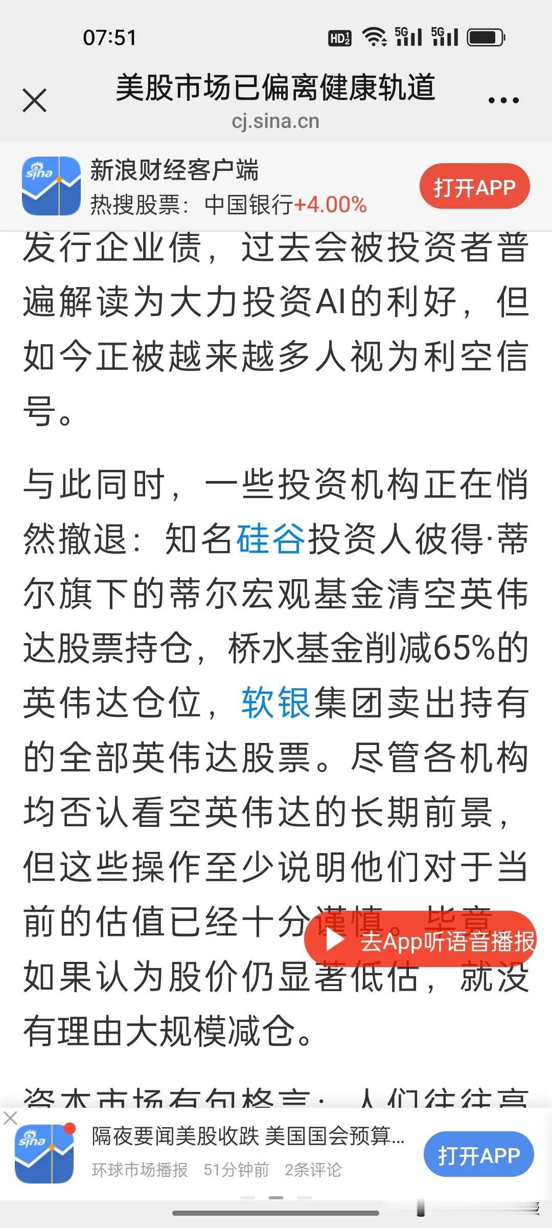 刚刚看到一篇《经济日报》对于近期美国股市的分析文章,文章标题为《美国市场已偏离健康轨道》,文章观点认为现在美股过分依赖英伟达的完美财报来维持稳定这就是偏离了正常轨道。 昨天美股大幅高开,一小时后却又过山车般大跌,其实,在孙正义的软银清仓英伟达,桥水基金减持65%的英伟达,就已经充分说明美国科技股泡沫即将破灭,英伟达不再是市场兴奋剂,当估值泡沫难掩盈利兑现乏力与杠杆风险的隐忧,美股这场依赖单一巨头的狂欢终将迎来理性的价值重构。重仓美股的那些活跃在国内的大佬们确实可以减仓规避风险了。