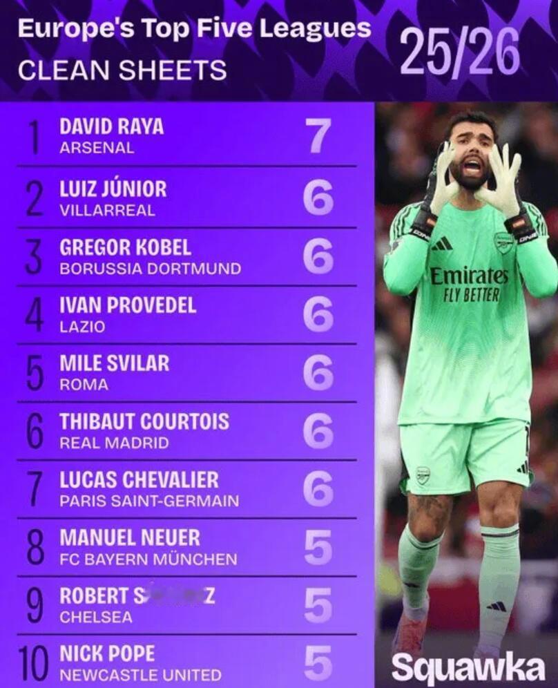 Squawka统计,截至目前欧洲五大联赛本赛季零封场次排名。欧洲五大联赛本赛季零封场次榜:1.拉亚(阿森纳):7场2.乔尼尔(比利亚雷亚尔):6场3.科贝尔(多特蒙德):6场4.普罗维德尔(拉齐奥):6场5.斯维拉尔(罗马):6场6.库尔图瓦(皇家马德里):6场7.舍瓦利埃(巴黎圣日耳曼):6场8.诺伊尔(拜仁慕尼黑):5场9.罗伯特-桑切斯(切尔西):5场10.波普(纽卡斯尔联):5场