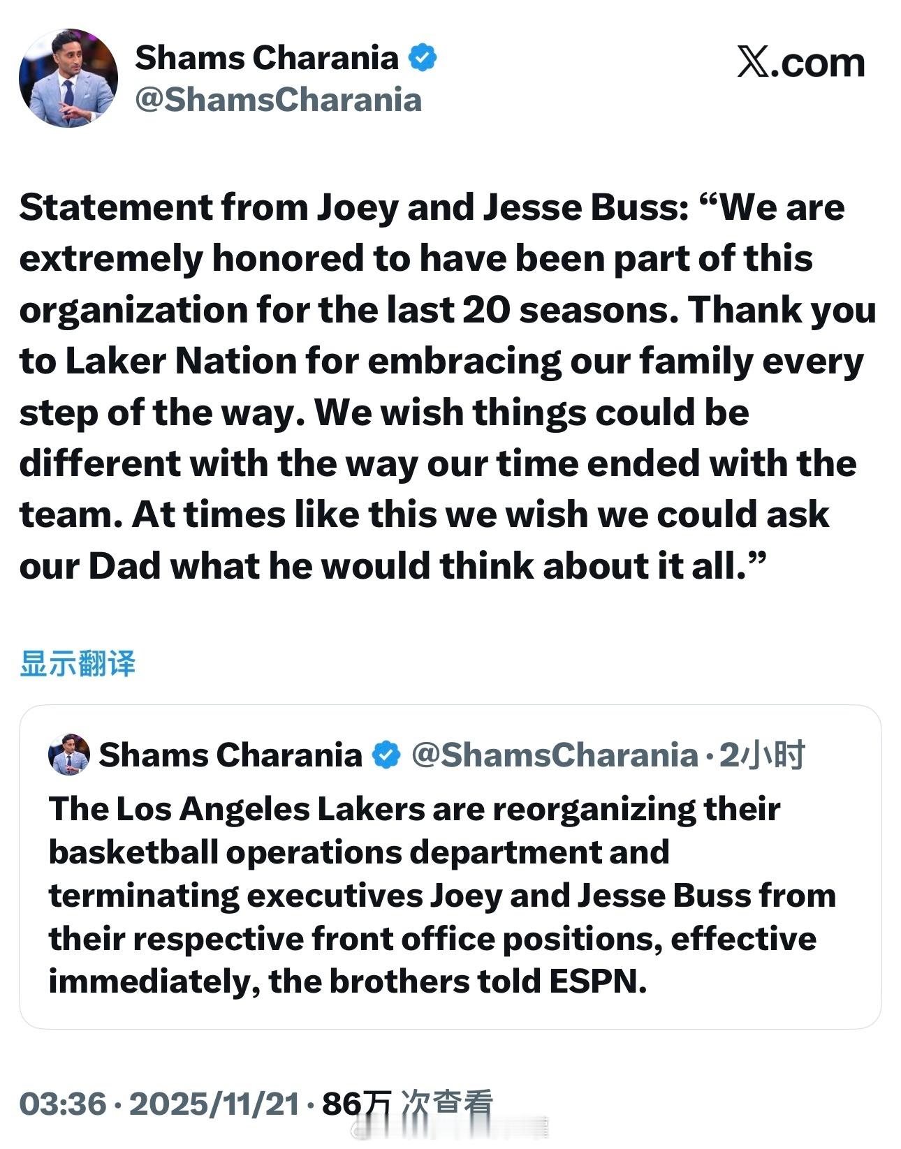 😮湖人新老板雷厉风行,今日重组篮球运营部门,立即解除了巴斯兄弟的职务。