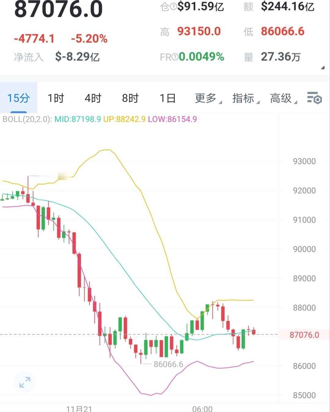 很多失败不是因为能力有限,而是因为没有坚持到底,昨日大饼再度瀑布下行,近期行情一直在强调在没有大利好的情况不必质疑反弹都是空,昨晚几波空依旧如约吃到爽。目前整体上看不断打破新底且阻力同步下移,大饼空头依旧明显,均线呈空头排列、日线连续收阴。虽然短期呈现下探后的回升,这意味着随时可能发生技术性反弹,短期上能理解为反弹调整,此时留意85500位置惹有效跌破可能会打开更大的下行空间。