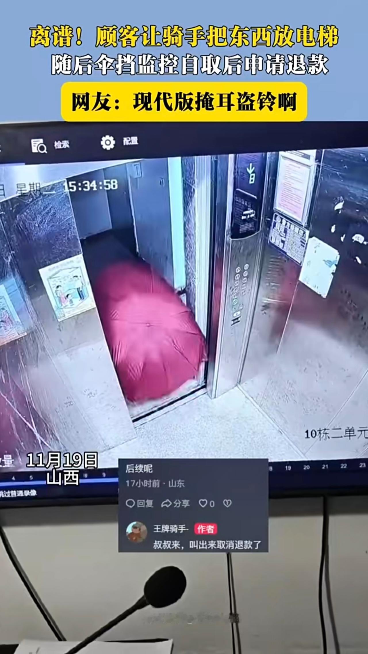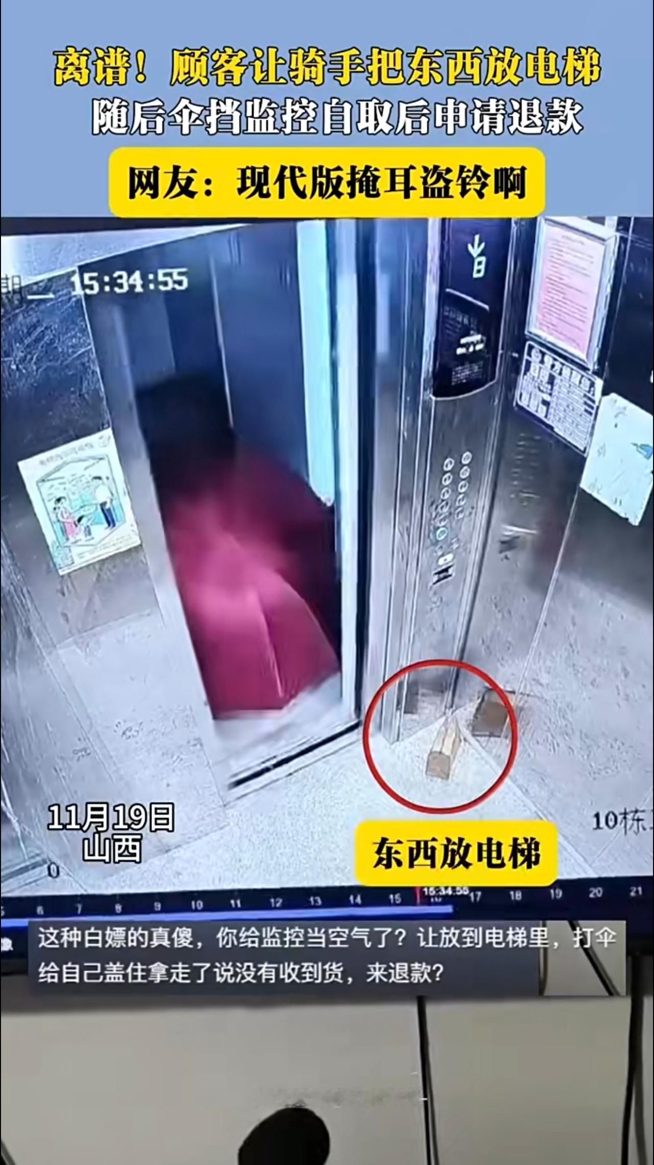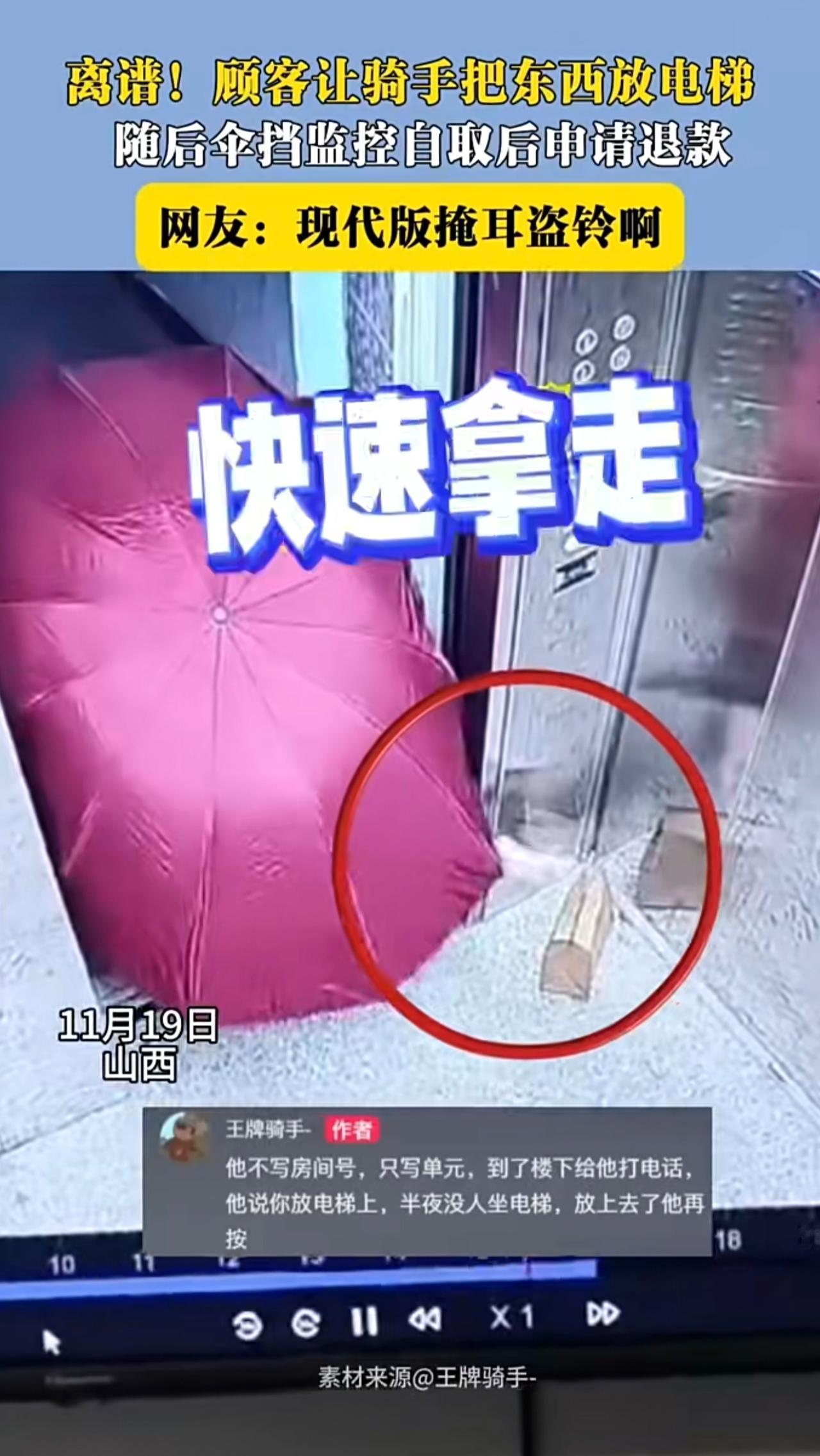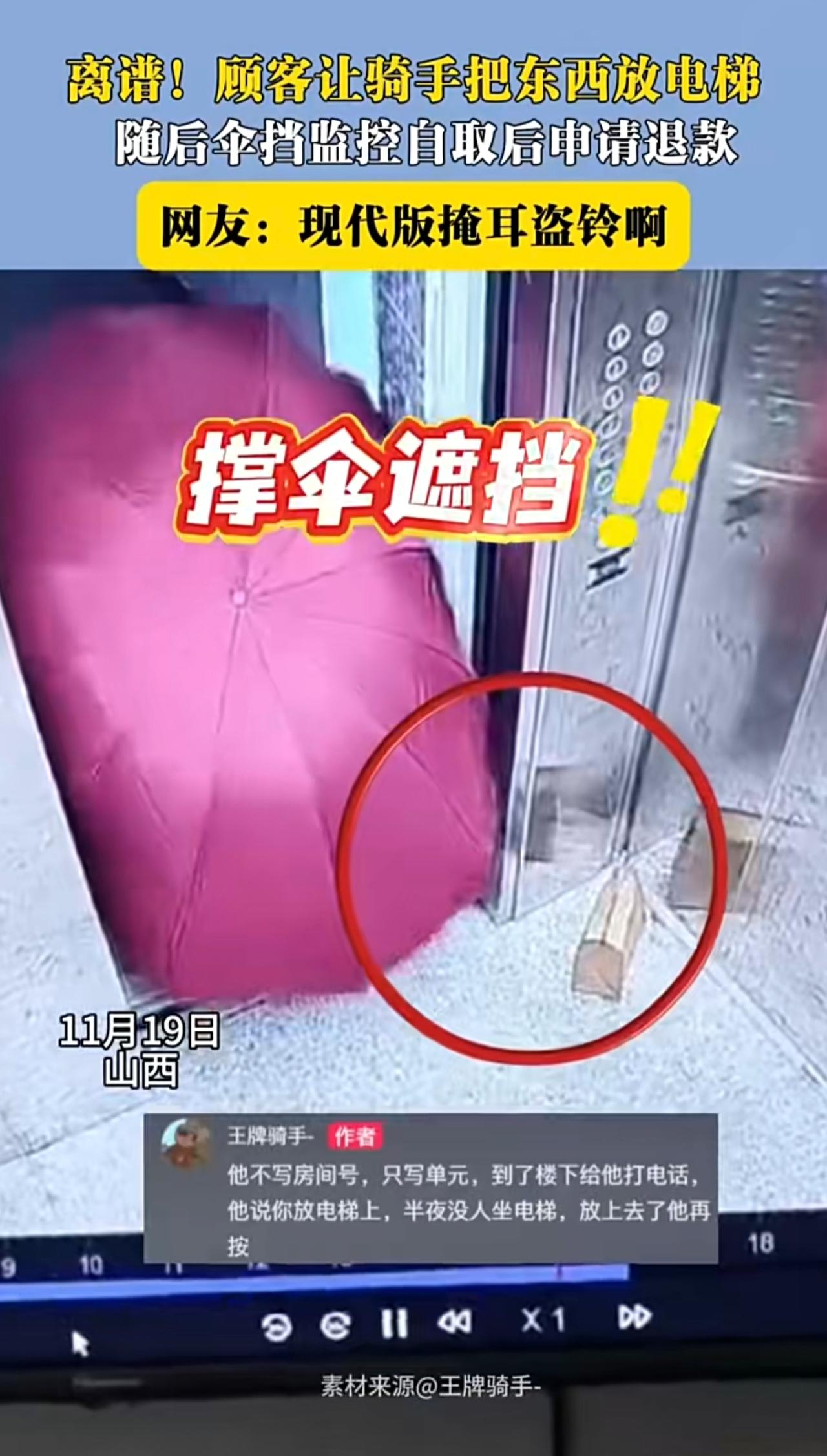 离谱!顾客让骑手把东西放电梯随后伞挡监控自取后中请退款。 网友: 现代版掩耳盜铃