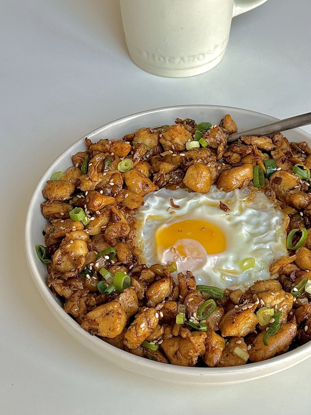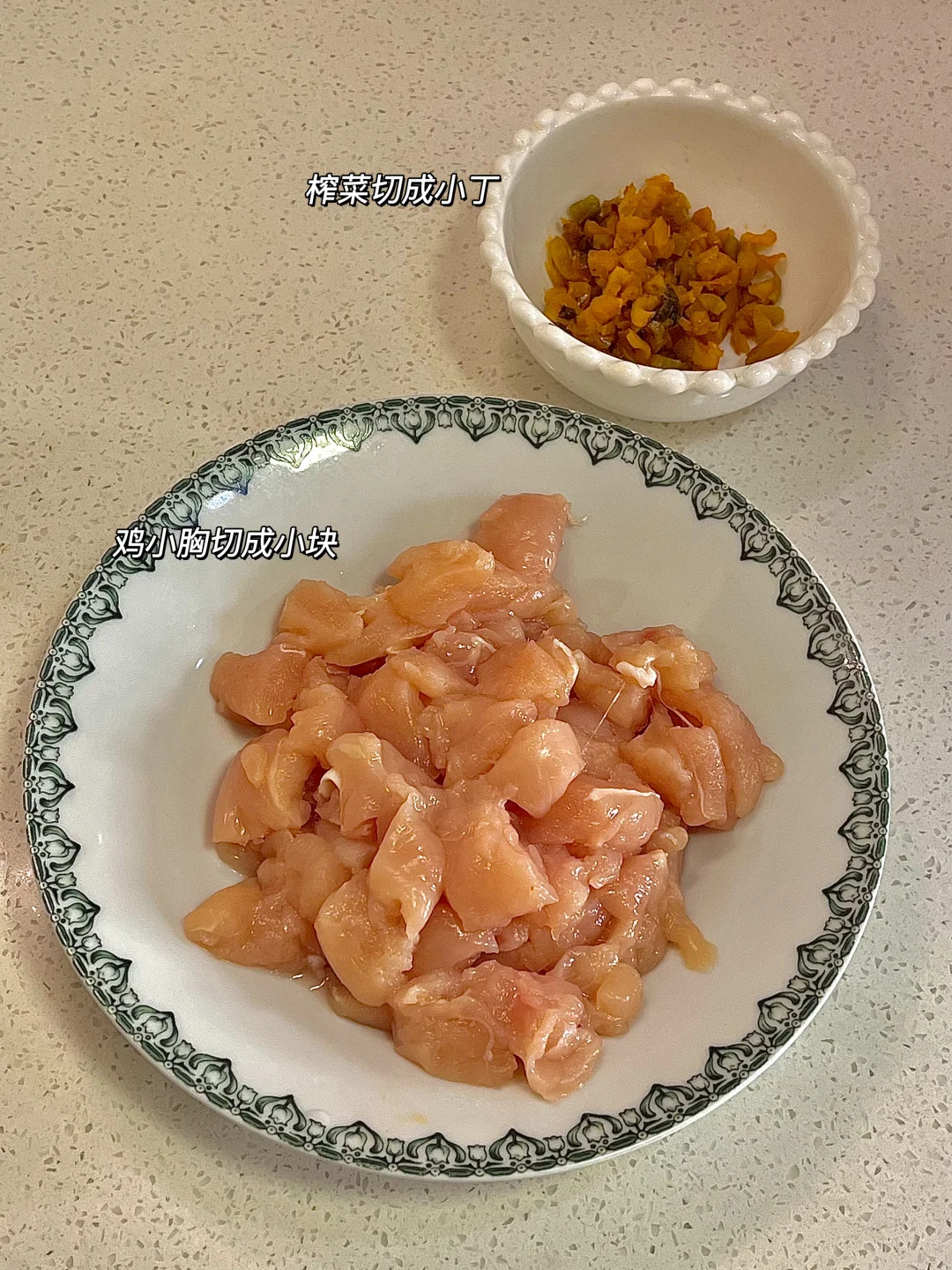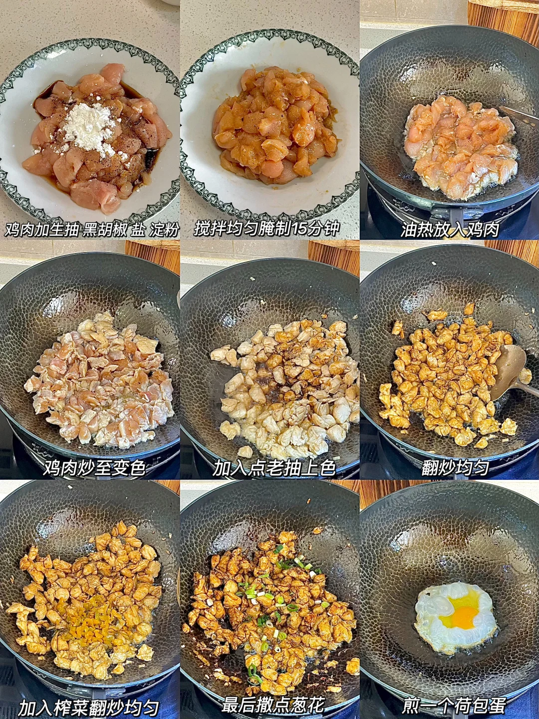 夏日消暑风味集 今日份一人食健康午餐分享: 日式碎鸡饭🍚 一杯冰大麦茶 . 食材:鸡小胸 榨菜丝 鸡蛋 做法如图上⬆️ . 鸡小胸可以换成鸡腿肉,鸡小胸做出来也是很嫩的 大家都去做,巨好吃下饭😋