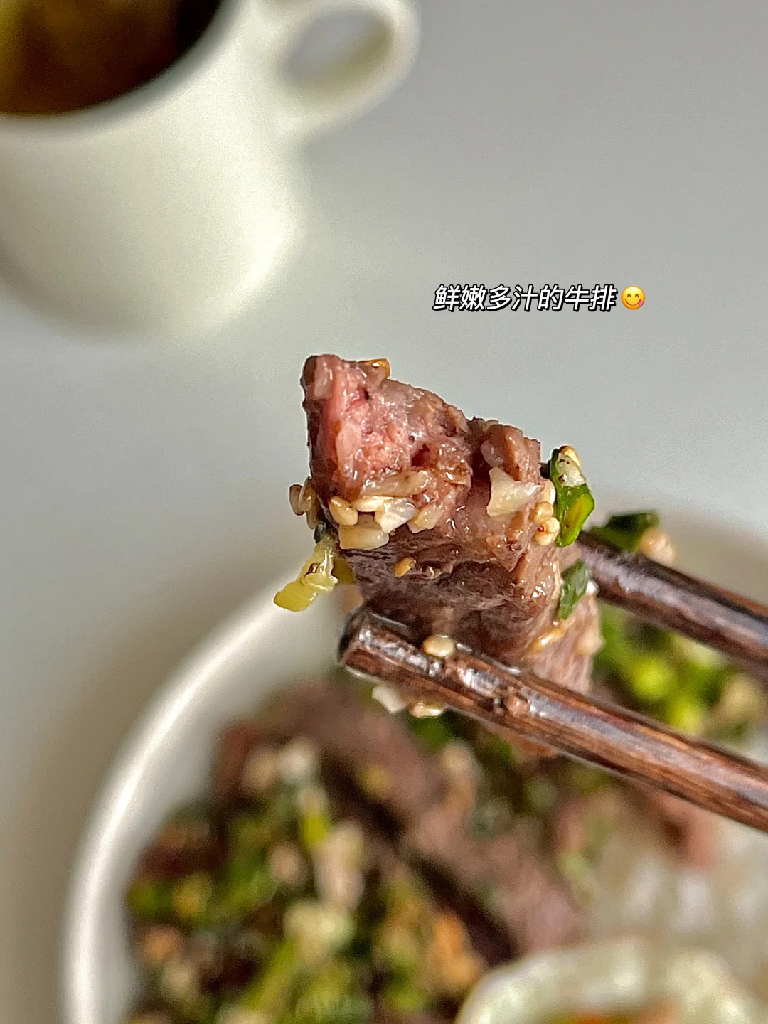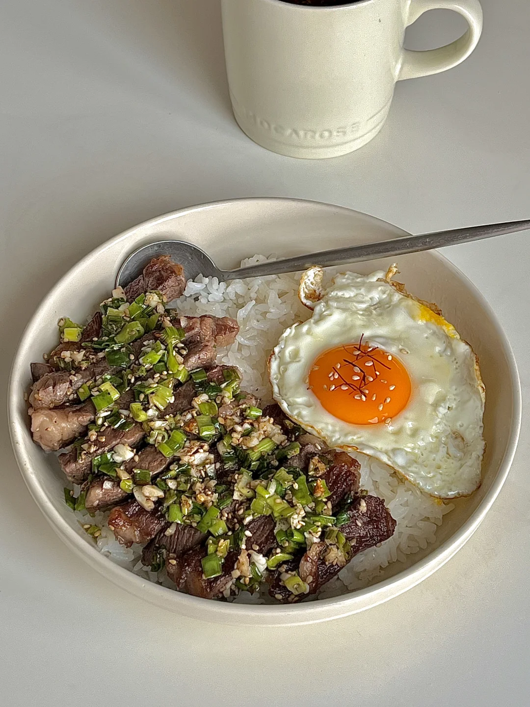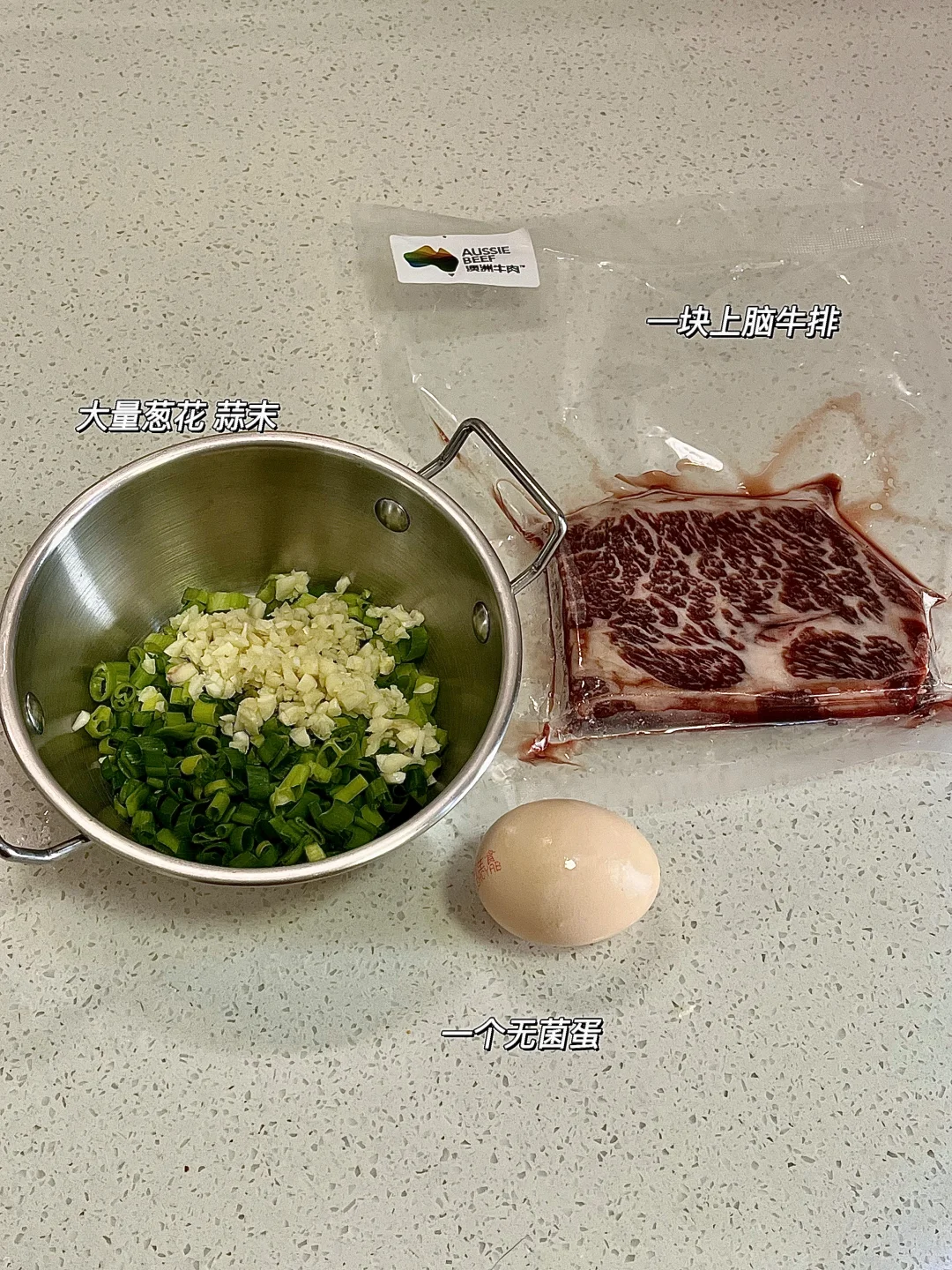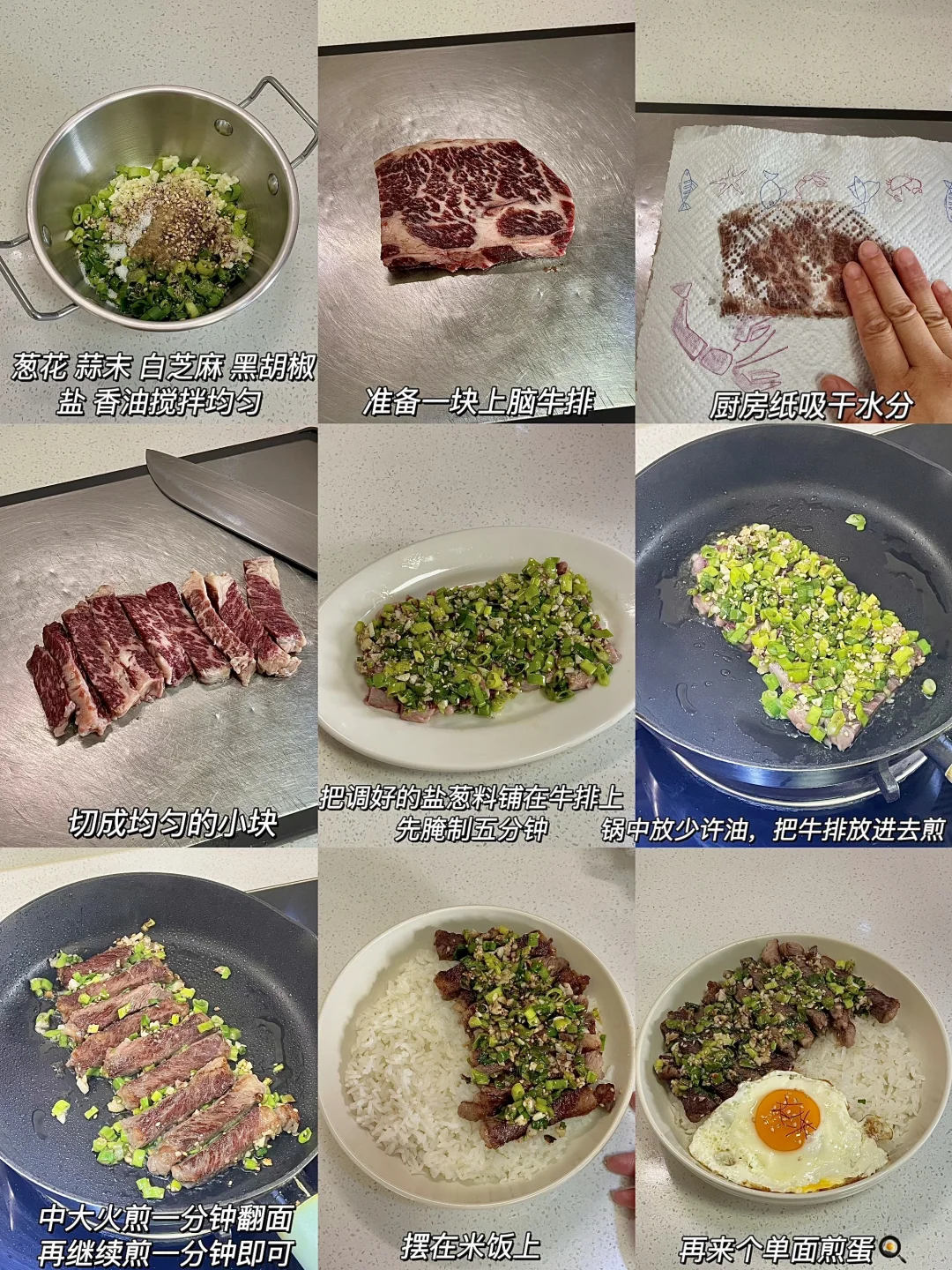 今日份一人食健康餐分享: 盐葱牛排饭🥩 一杯小金桂茶 . 食材:一块澳洲上脑牛肉 一个无菌蛋 大量葱花 蒜末 黑胡椒 白芝麻 盐 香油(调料根据自己的口味调) 做法如图上⬆ . 大家好久不见啦!最近在医院照顾妈妈,都没有好好吃饭🍚 回来的第一餐给自己做了一份满满蛋白质的 盐葱牛排饭~ 我用的是澳洲上脑牛排 上脑比较嫩 平底锅两面各煎一分钟就可以了 鲜嫩多汁,搭配这个盐葱酱绝了😋 澳洲牛肉Aussie牛羊肉职场青年的5分钟魔法料理一人食吃什么给自己做顿饭吃的干净才能长得干净干净饮食
