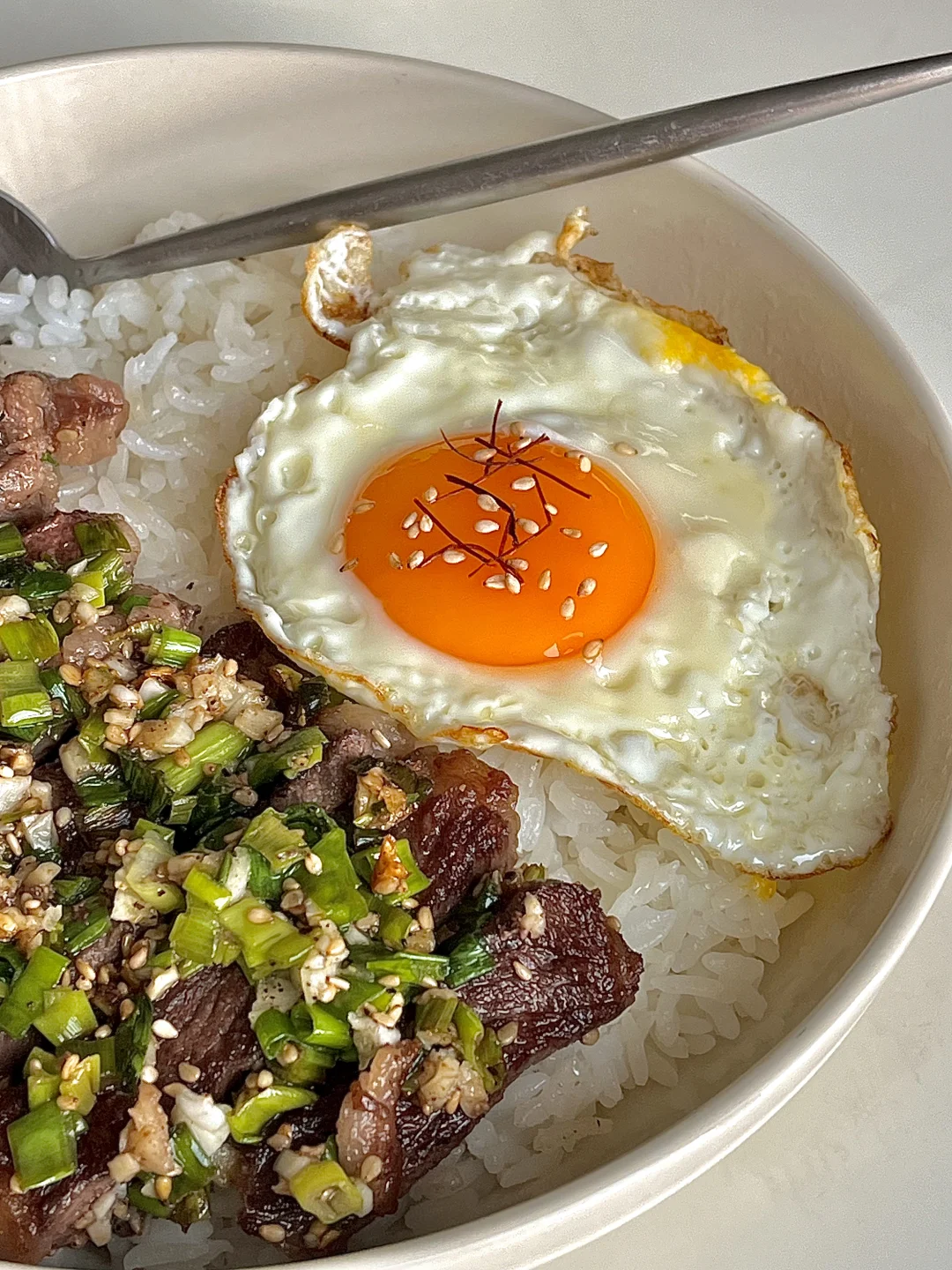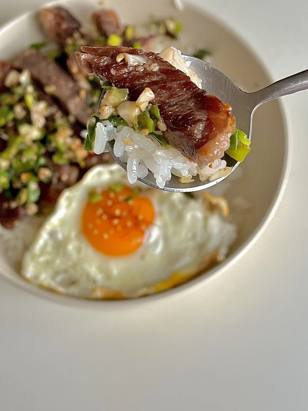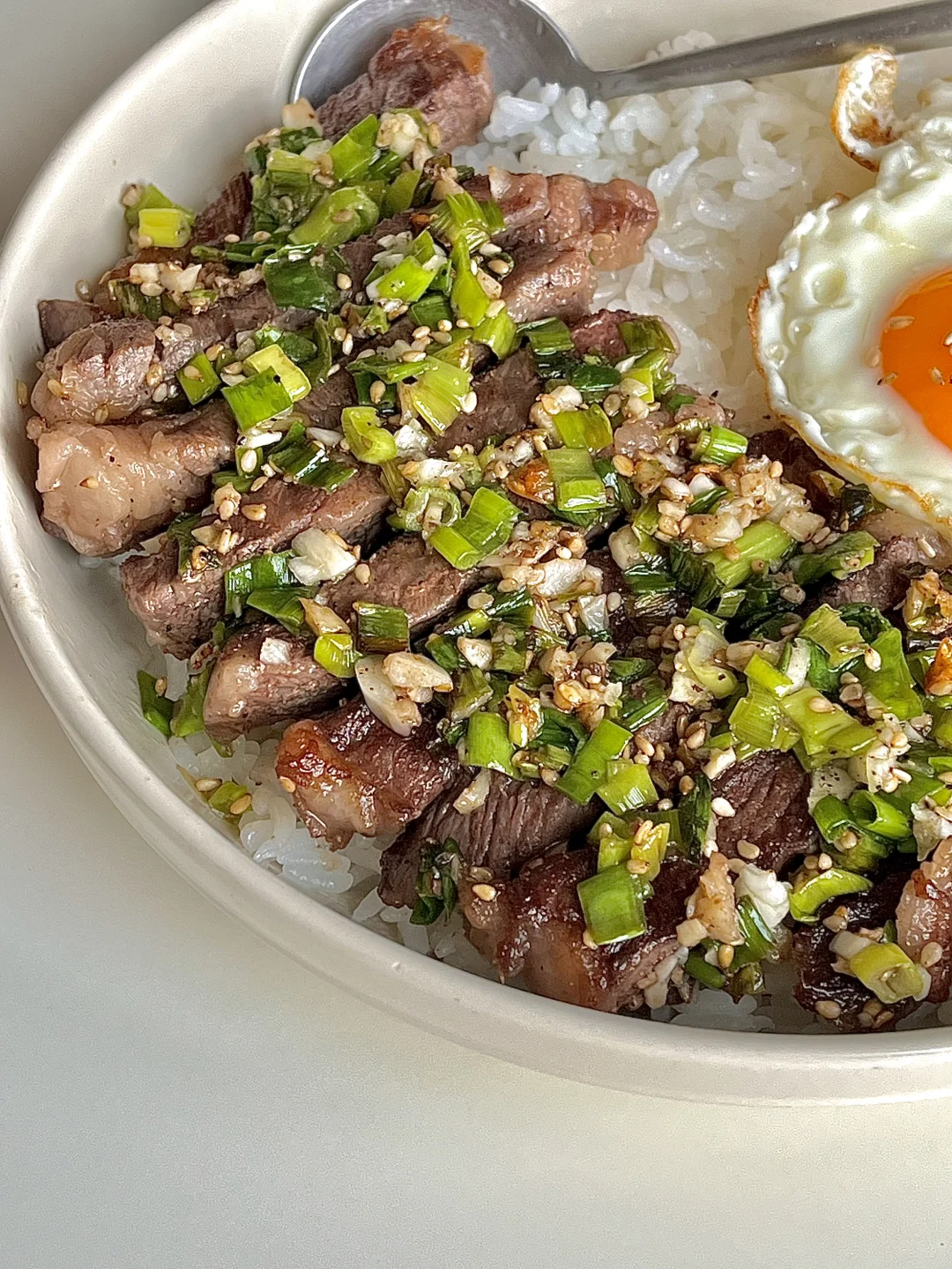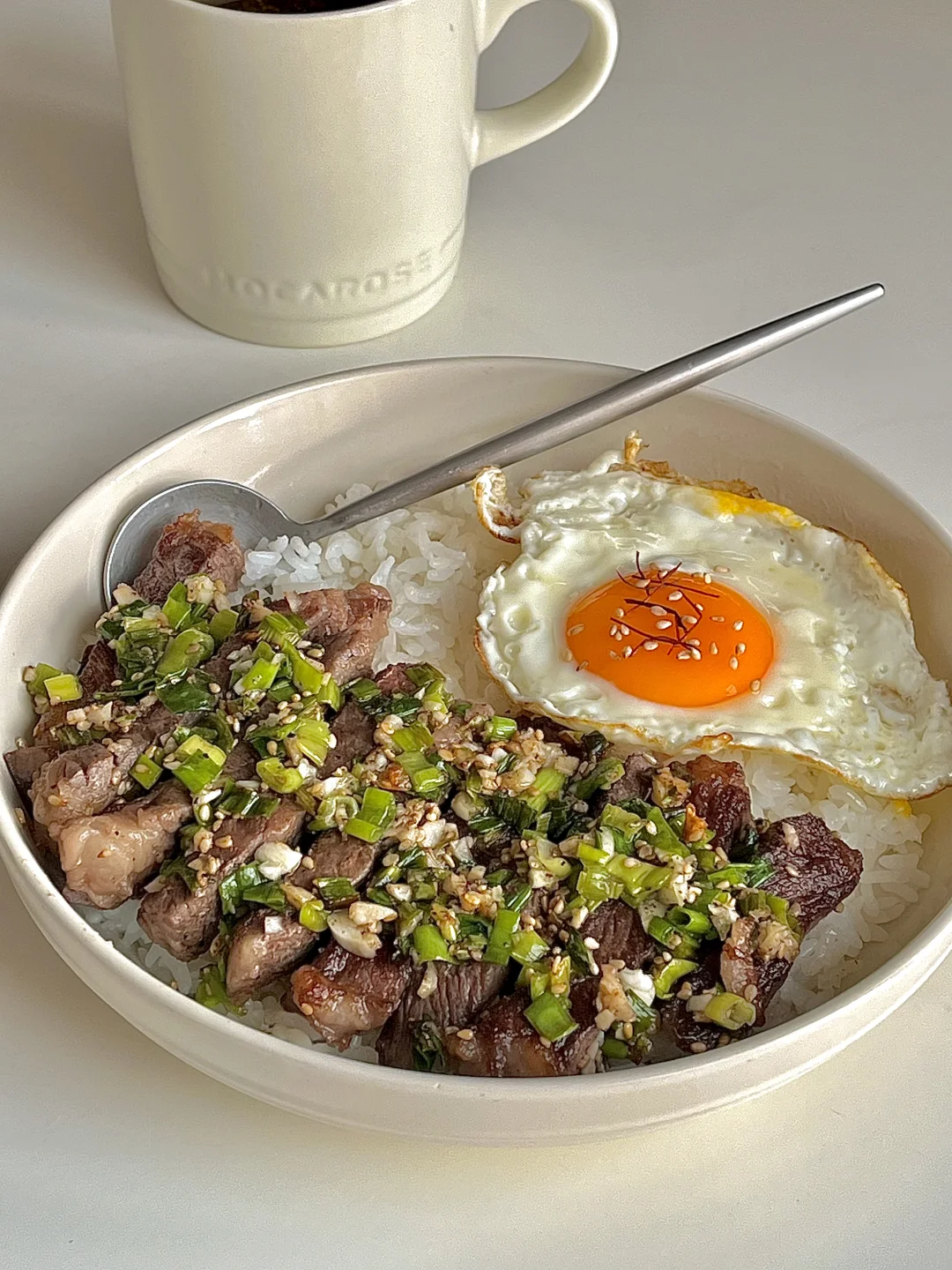 今日份一人食健康餐分享: 盐葱牛排饭🥩 一杯小金桂茶 . 食材:一块澳洲上脑牛肉 一个无菌蛋 大量葱花 蒜末 黑胡椒 白芝麻 盐 香油(调料根据自己的口味调) 做法如图上⬆ . 大家好久不见啦!最近在医院照顾妈妈,都没有好好吃饭🍚 回来的第一餐给自己做了一份满满蛋白质的 盐葱牛排饭~ 我用的是澳洲上脑牛排 上脑比较嫩 平底锅两面各煎一分钟就可以了 鲜嫩多汁,搭配这个盐葱酱绝了😋 澳洲牛肉Aussie牛羊肉职场青年的5分钟魔法料理一人食吃什么给自己做顿饭吃的干净才能长得干净干净饮食
