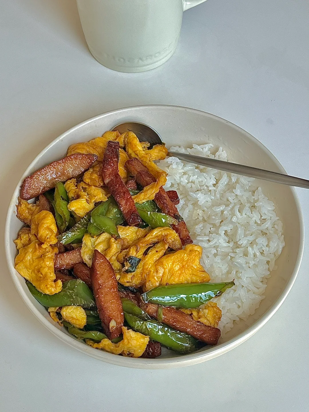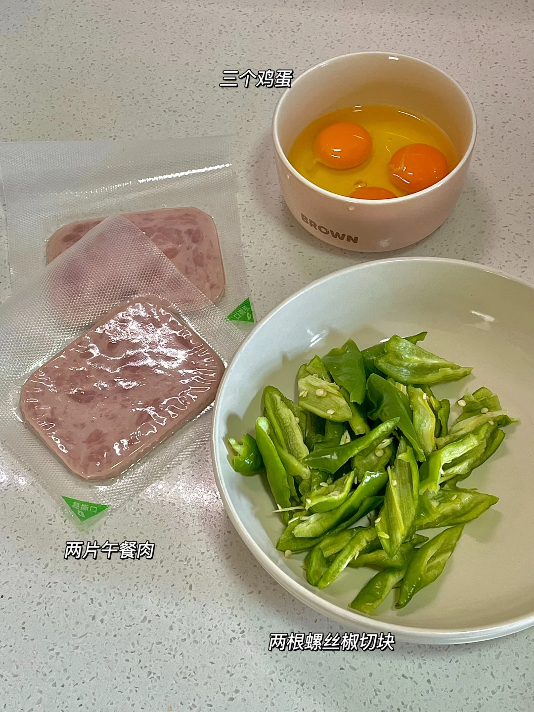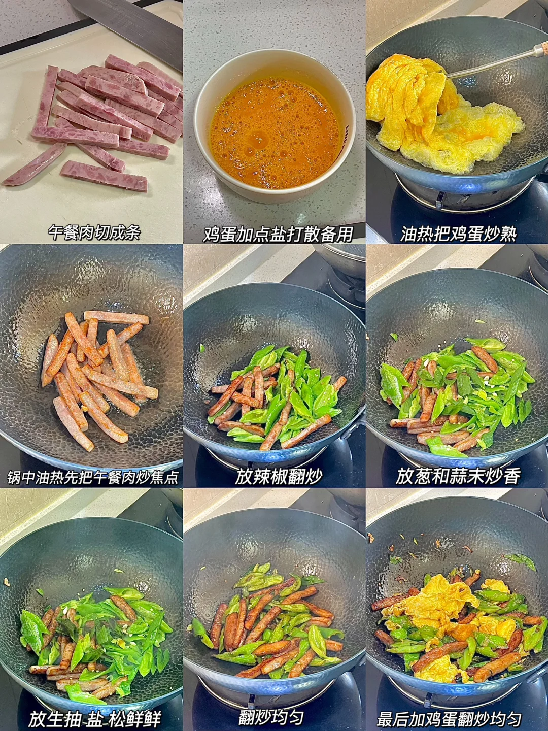 做菜我是认真的 我家的春天真好吃 今日一人食午餐分享: 辣椒鸡蛋炒午餐肉 一杯大麦茶 . 食材:三个鸡蛋 两片午餐肉 两根螺丝椒 葱和蒜 做法如图上⬆️ . 午餐肉炒的焦焦的,搭配鸡蛋和辣椒绝绝子~