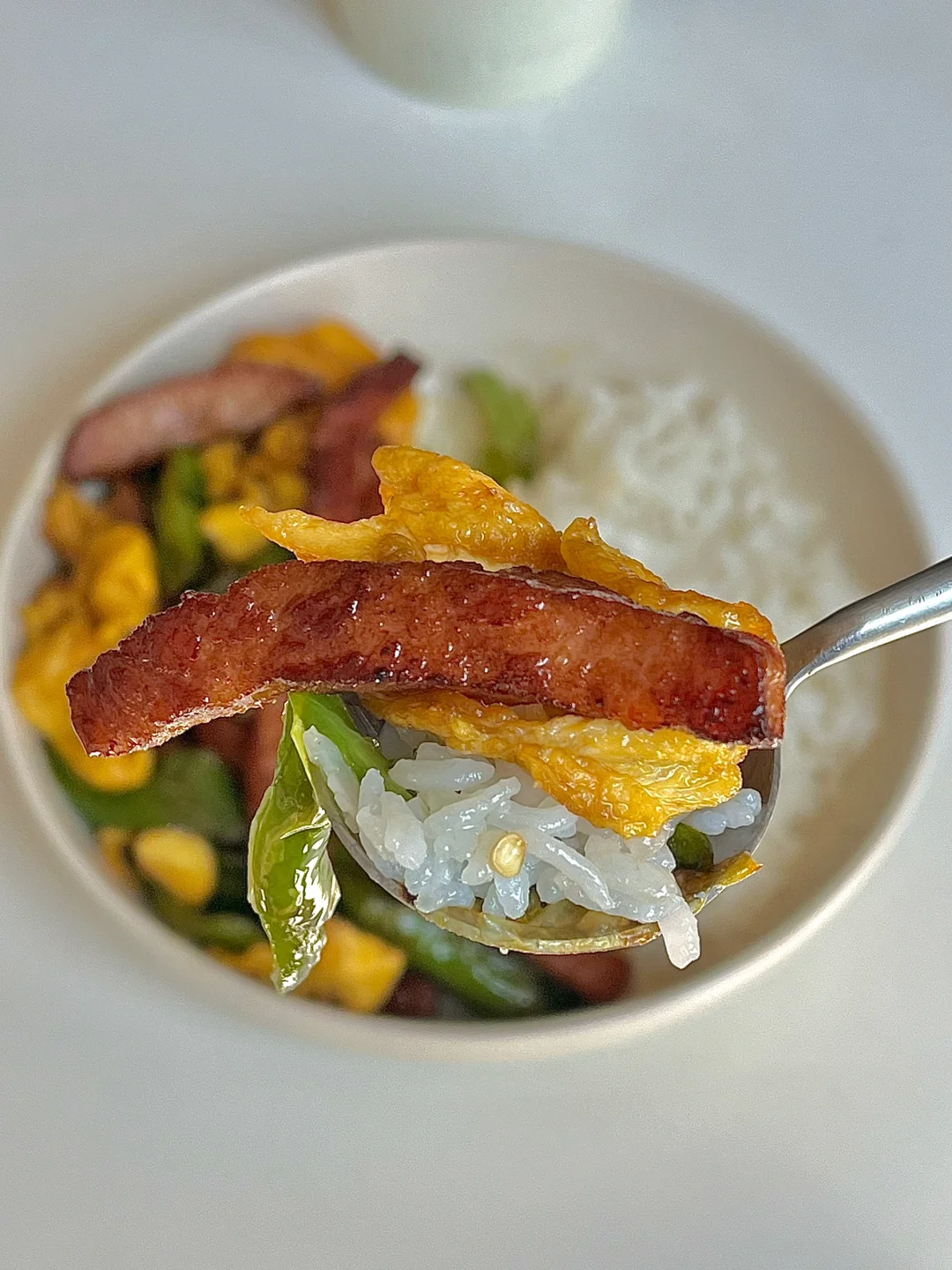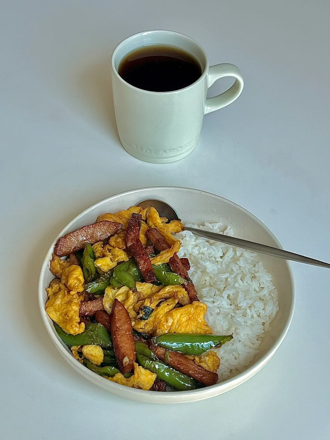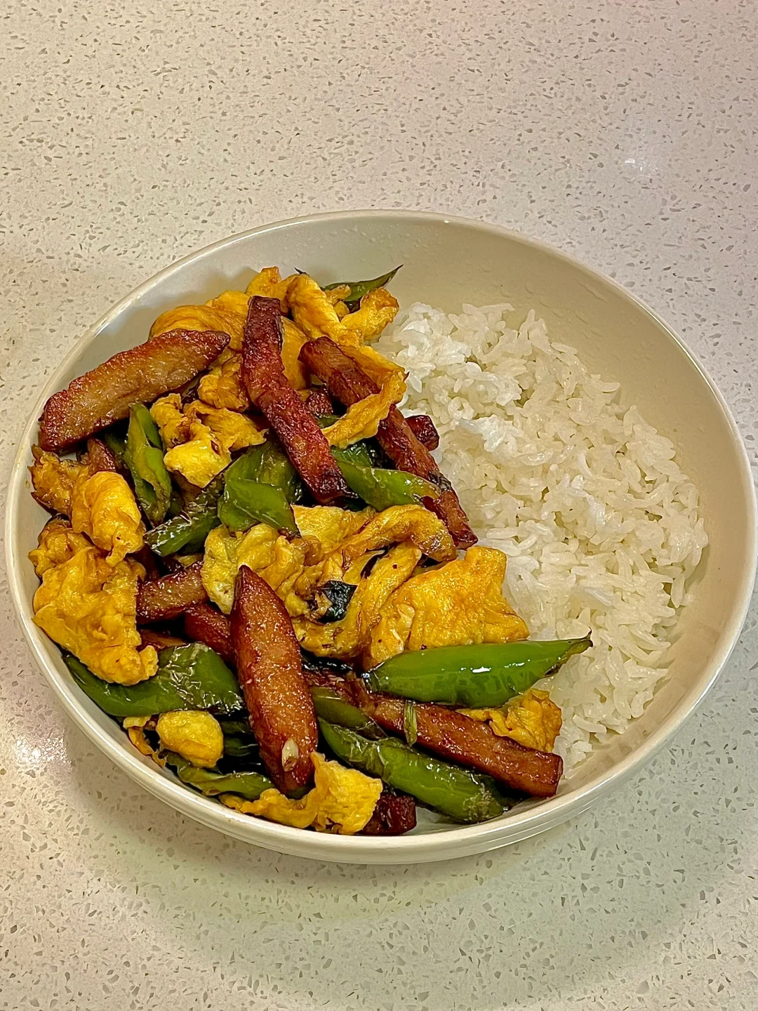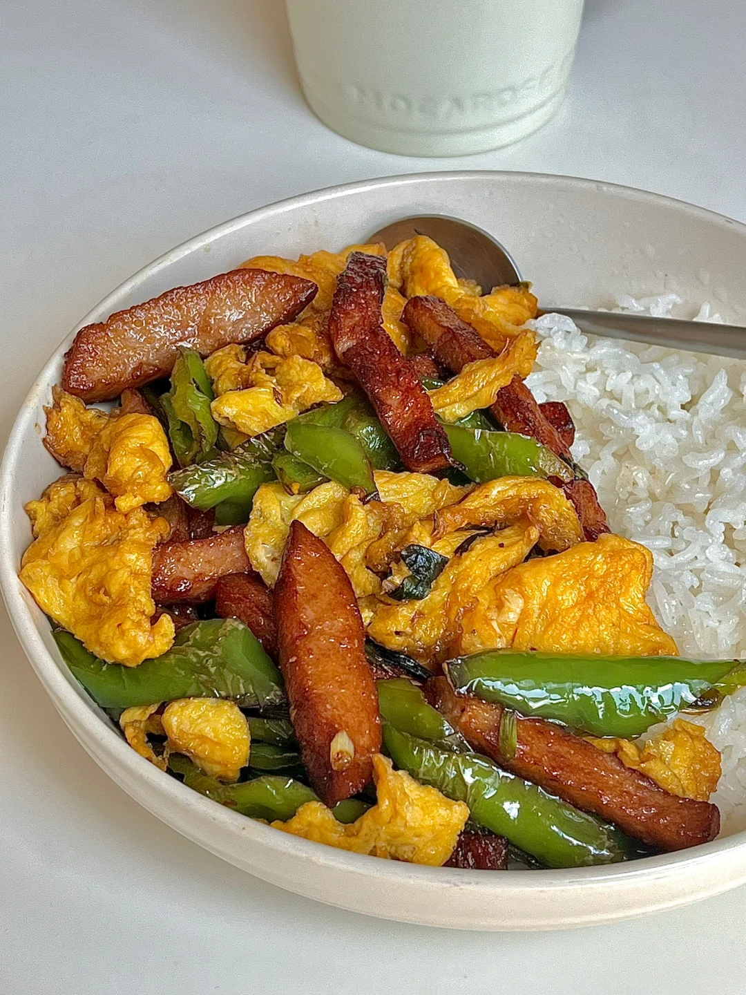 做菜我是认真的 我家的春天真好吃 今日一人食午餐分享: 辣椒鸡蛋炒午餐肉 一杯大麦茶 . 食材:三个鸡蛋 两片午餐肉 两根螺丝椒 葱和蒜 做法如图上⬆️ . 午餐肉炒的焦焦的,搭配鸡蛋和辣椒绝绝子~