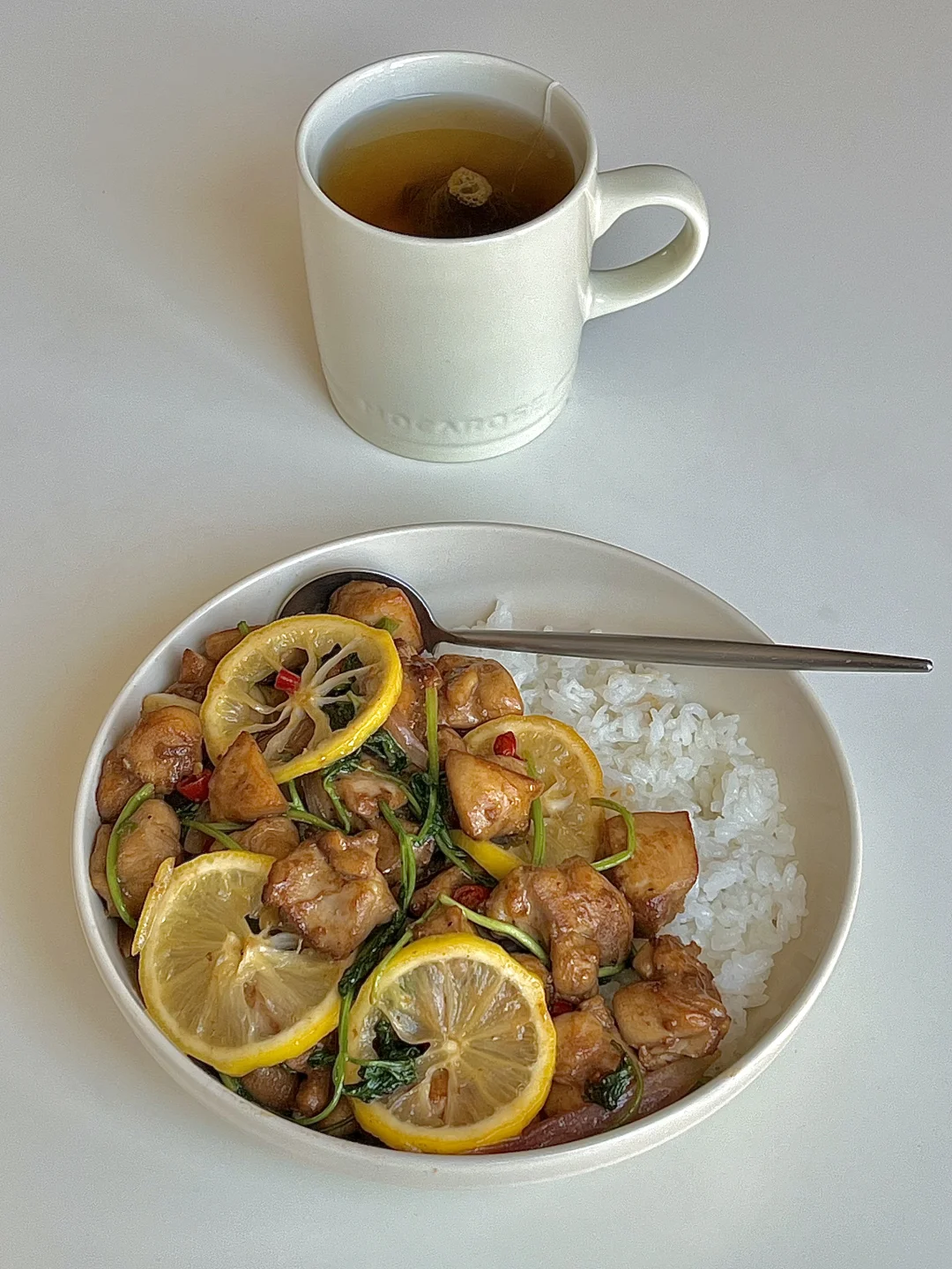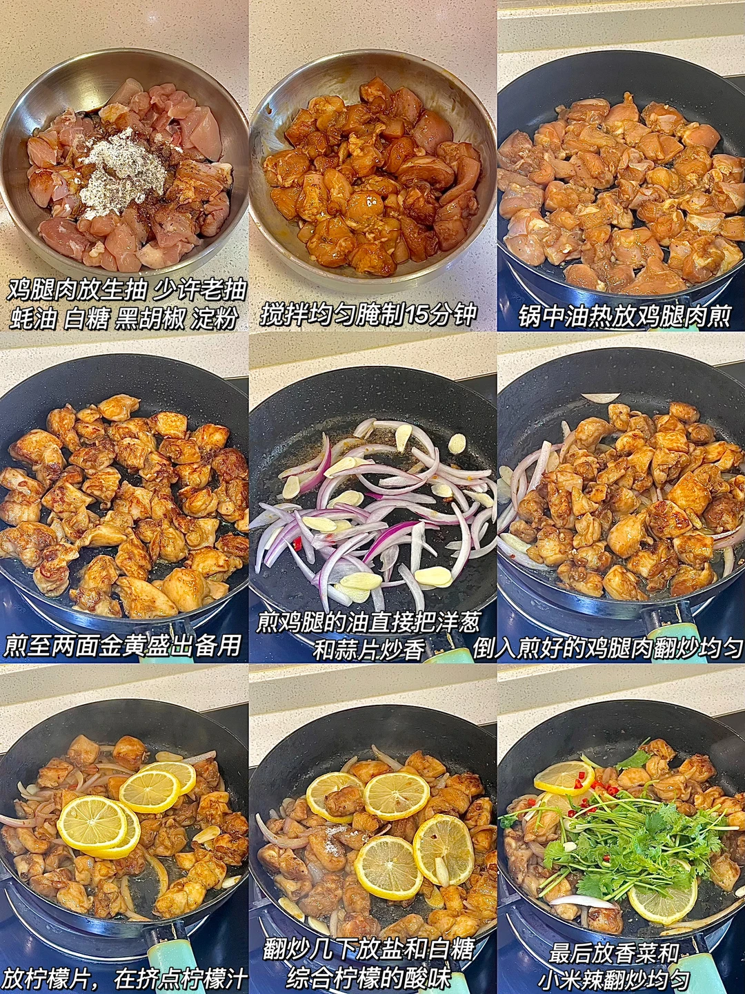 夏日消暑风味集 今日份一人食健康午餐分享: 柠檬煎鸡腿 白米饭 一杯红茶☕️ . 食材:去骨去皮鸡腿肉 柠檬 洋葱 香菜 蒜片 小米辣 做法如图上⬆️ . 今天用的鸡腿肉比较方便哦 去骨去皮还切好块了 适合上班族和宝妈的高品质无抗的冷冻鸡肉😋 这样做的鸡腿肉鲜嫩多汁又清爽解腻,大家可以抄作业试试看