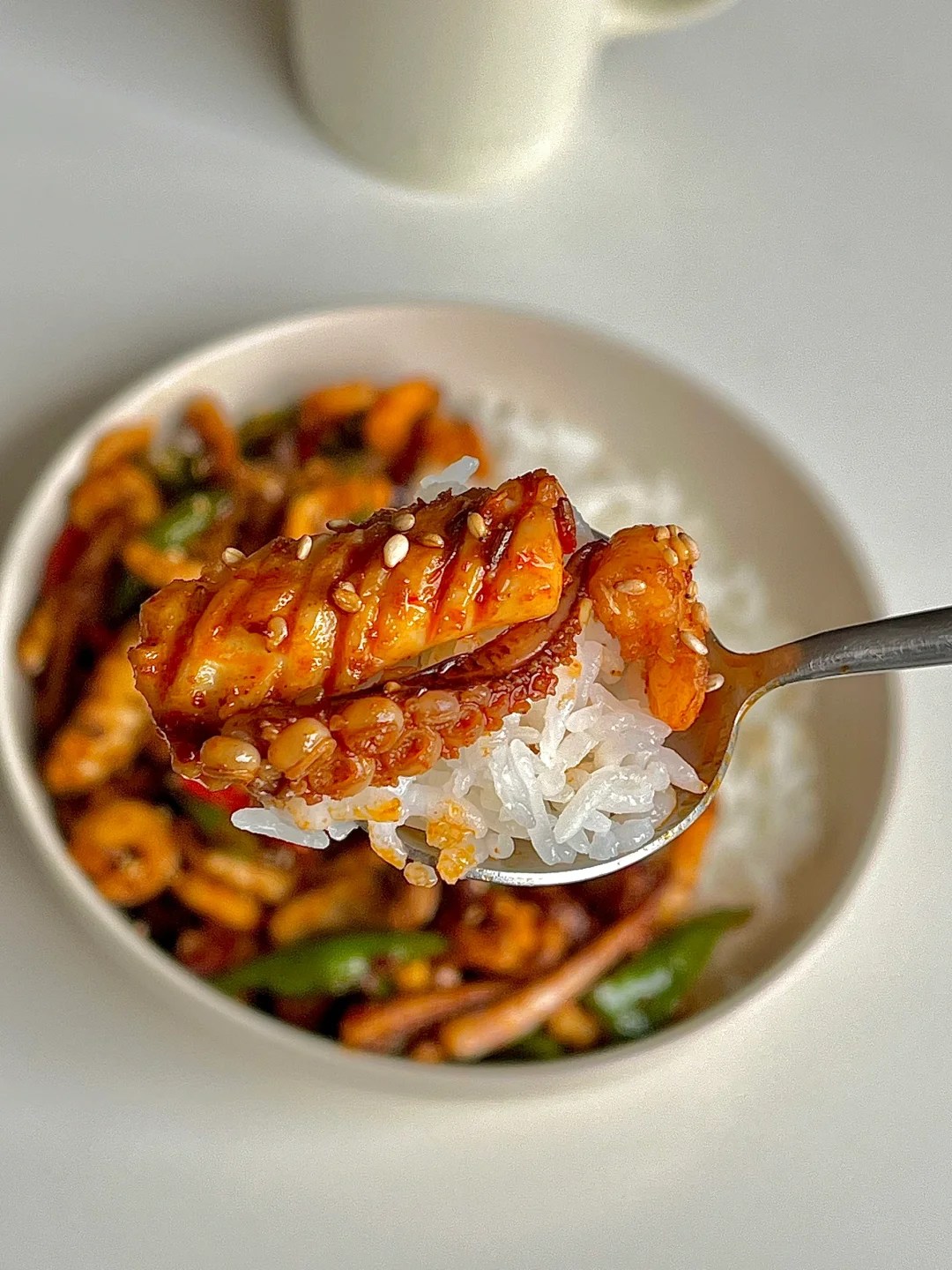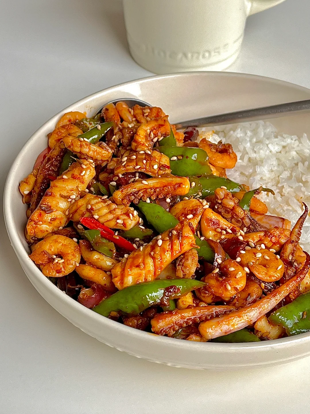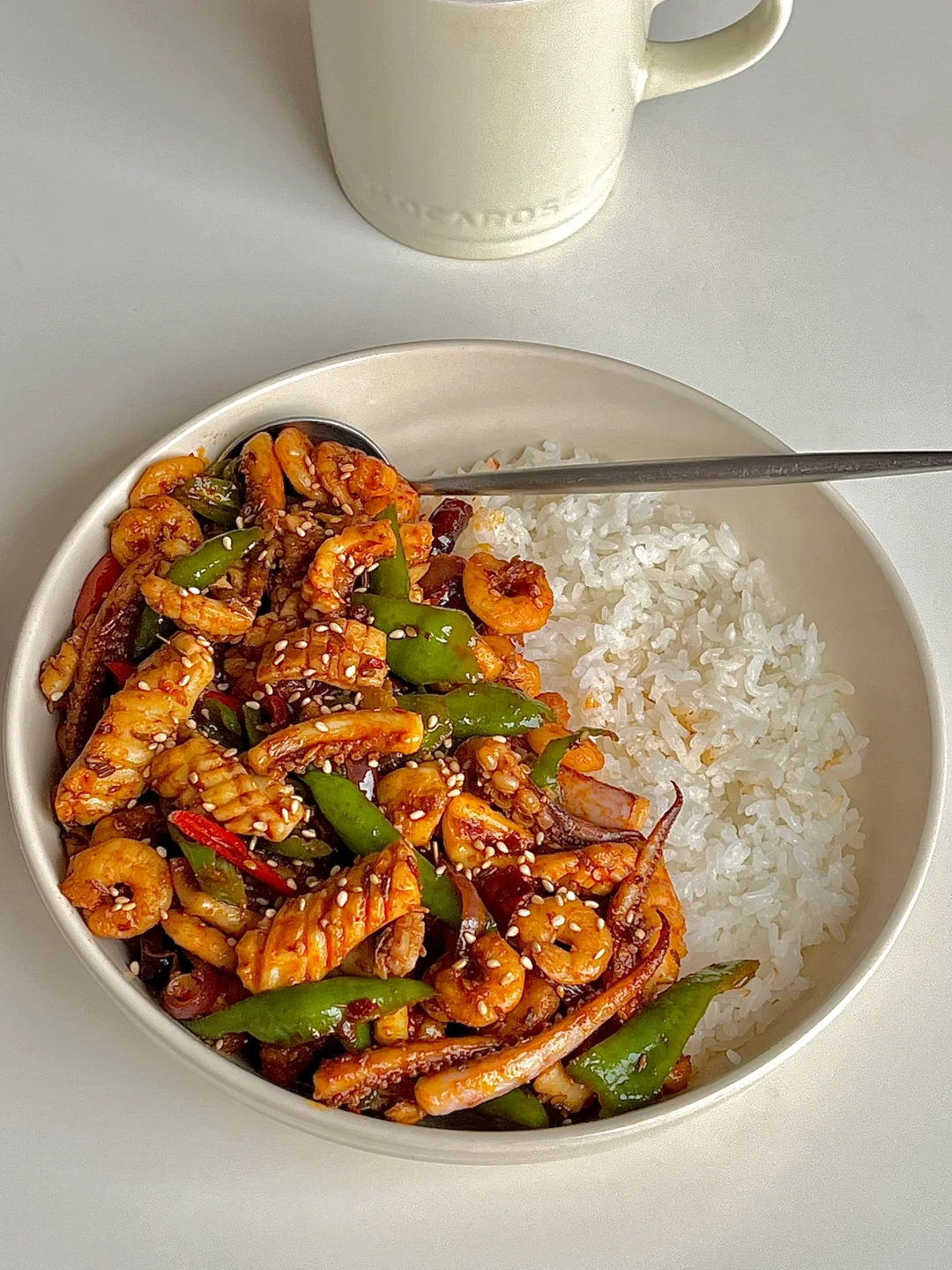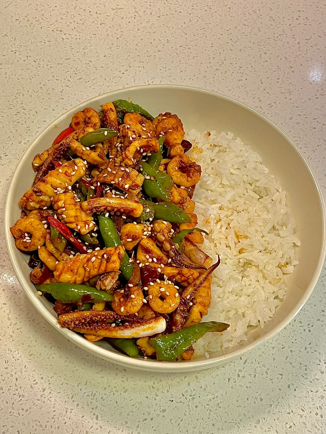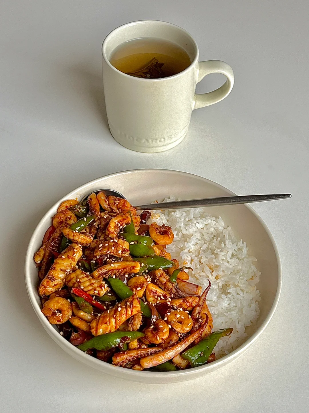 做菜我是认真的 我家的春天真好吃 今日份一人食午餐分享: 爆炒鱿鱼虾仁🍤 白米饭🍚 一杯茉莉花茶 . 食材:鱿鱼🦑 小虾仁 青红辣椒丝 洋葱丝 蒜片 干辣椒 花椒 做法如图⬆️ . 真的是太喜欢吃爆炒的鱿鱼了,贼下饭😋 我不太喜欢吃豆瓣酱的味道,就加了韩式细辣椒粉上色,这样才原汁原味好吃😋