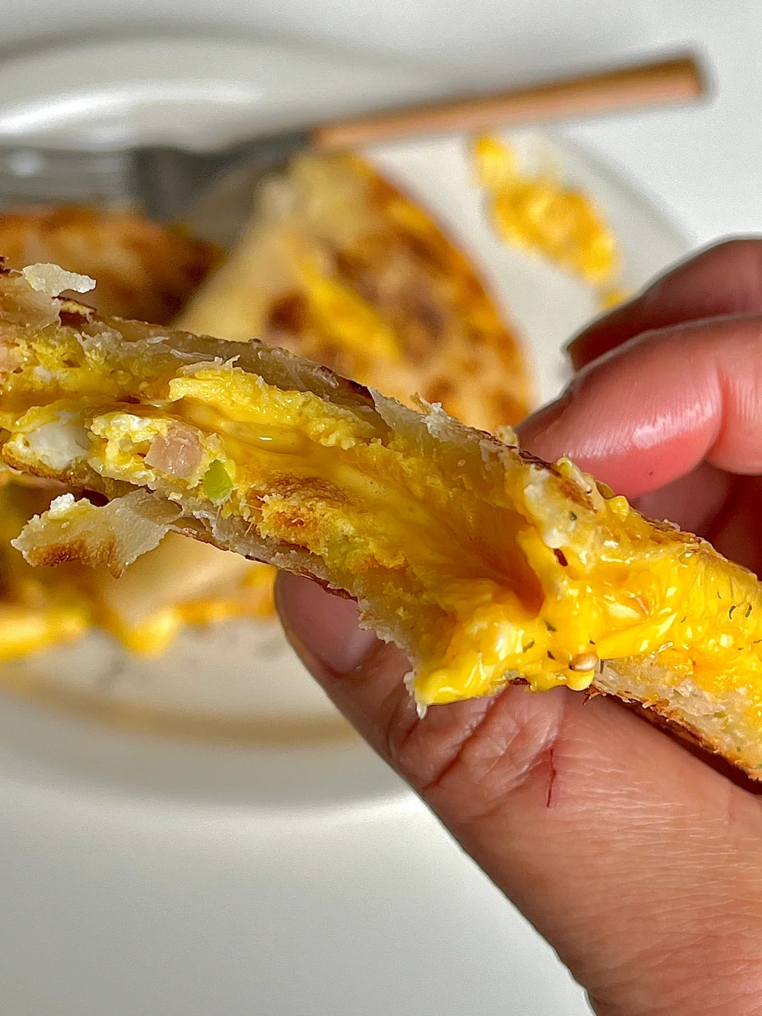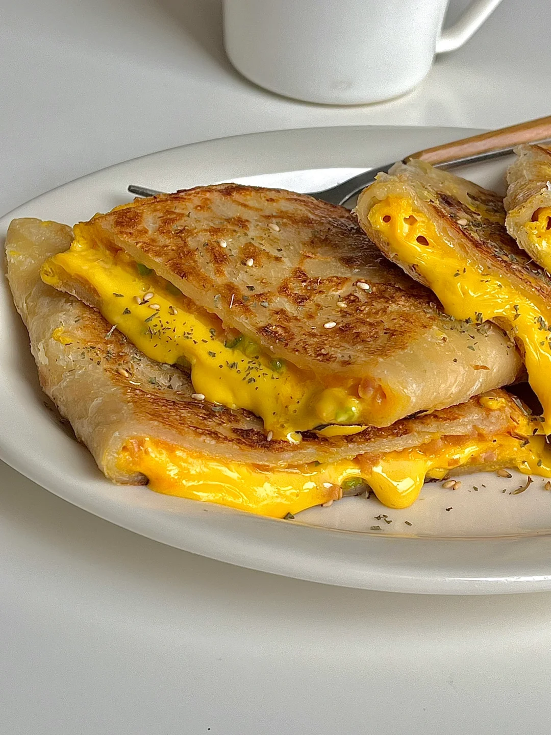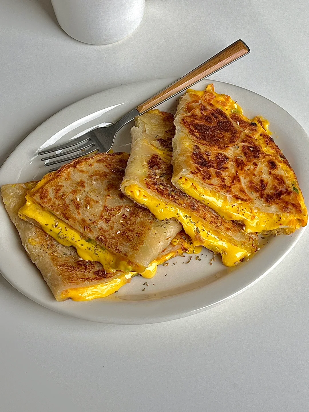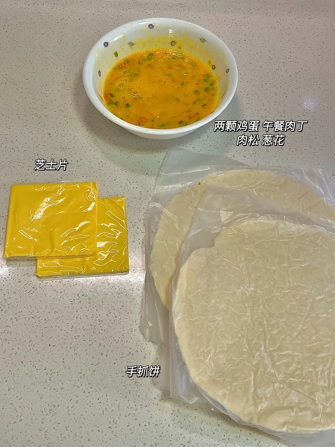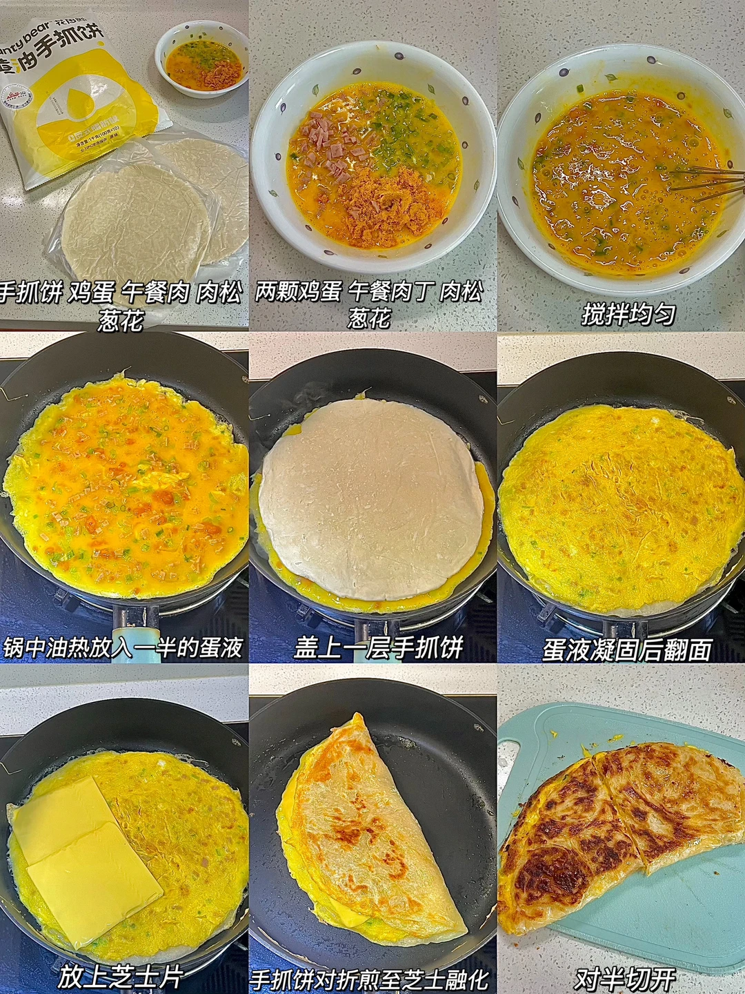 我家的春天真好吃 今日份一人食早午餐分享: 葱香肉松午餐肉爆浆芝士手抓饼 一杯黑咖啡☕️ . 食材:两张手抓饼 两片芝士 两个鸡蛋 一块午餐肉 肉松 葱花 做法如图上⬆️ . 好久没吃手抓饼了🫓今天安排上,芝士满满真的巨好次😋 吃手抓饼也要吃健康的哦!今天吃的手抓饼是黄油替代起酥油,家里有小朋友的也可以放心吃哦!