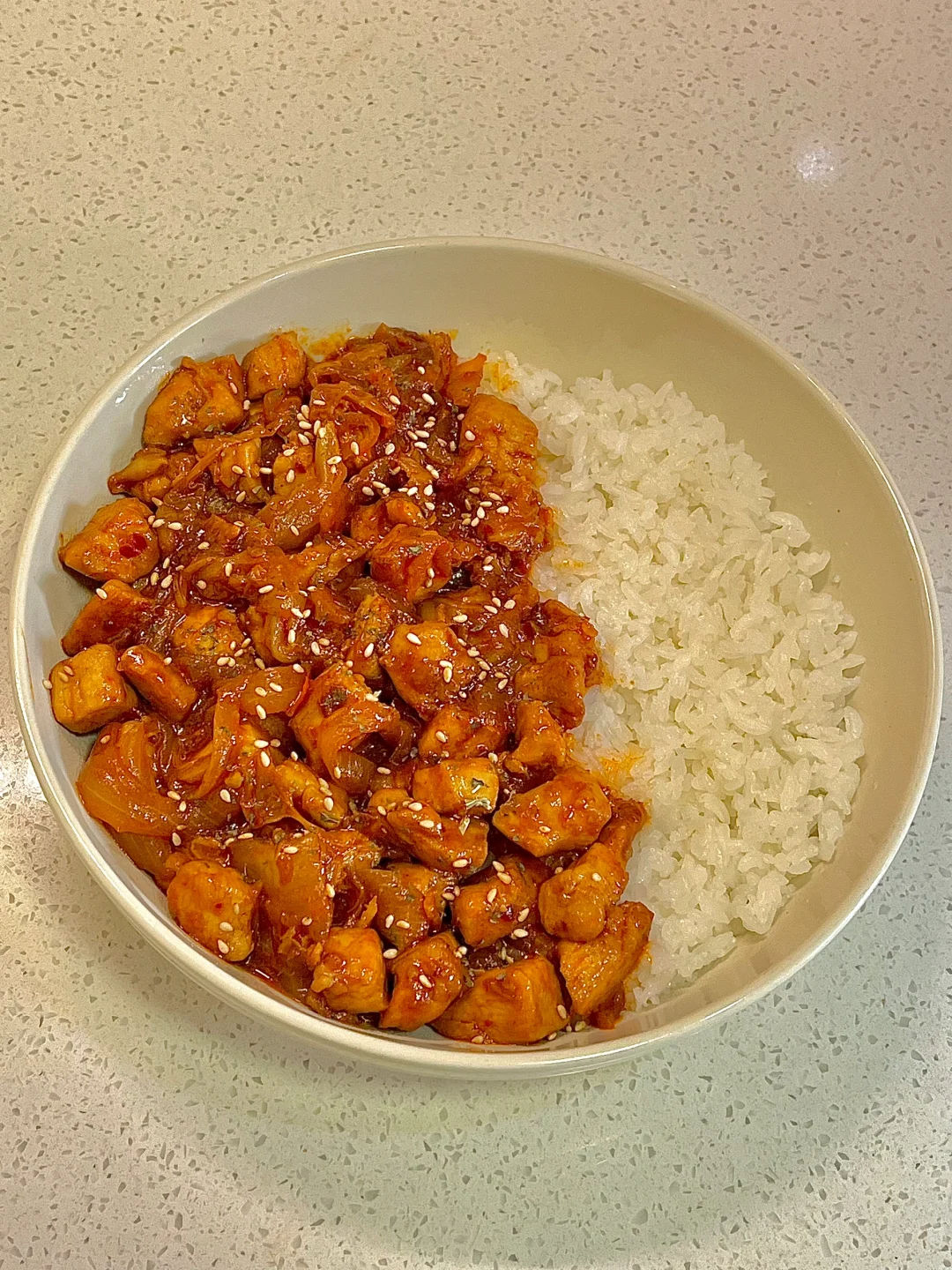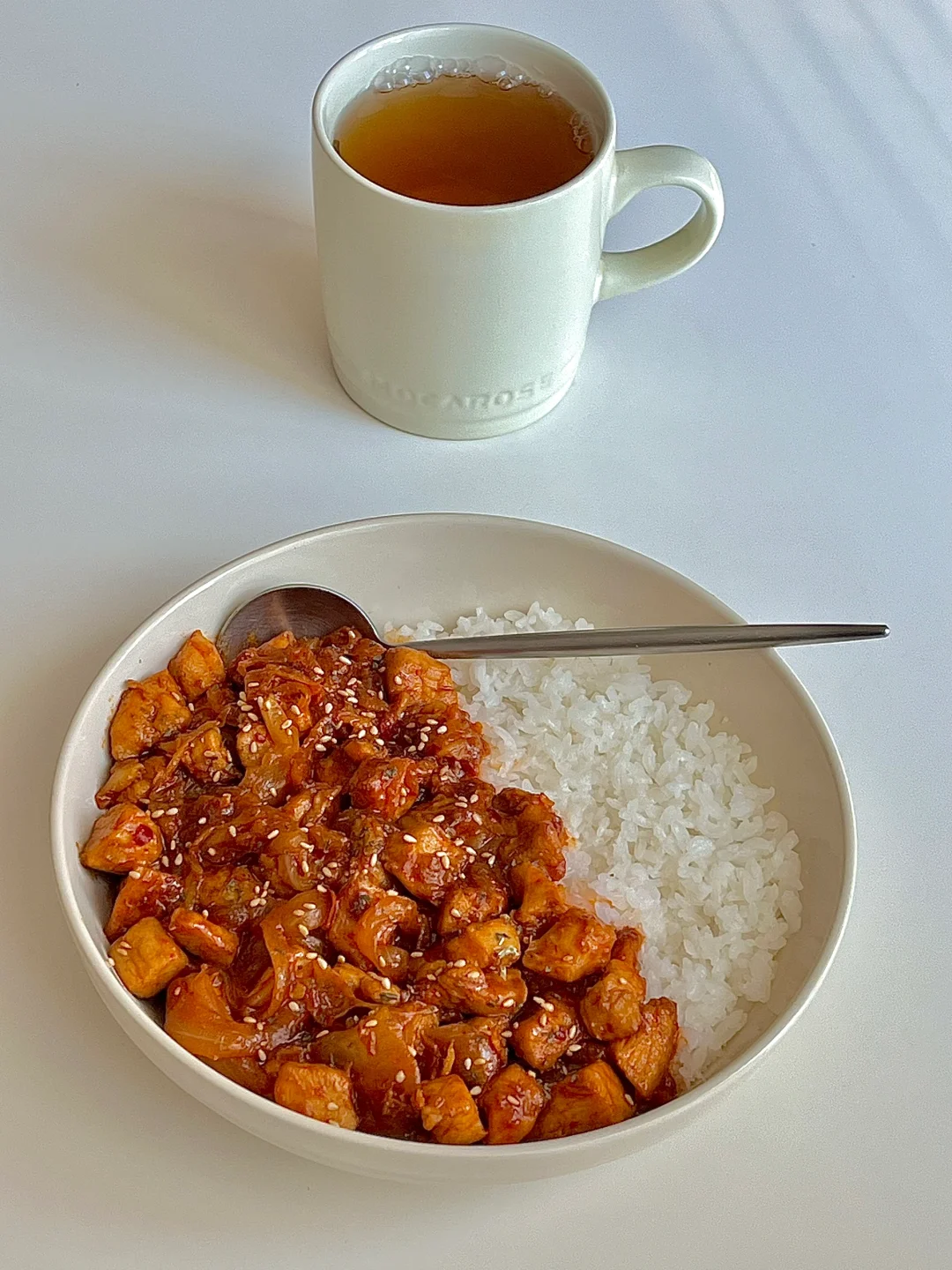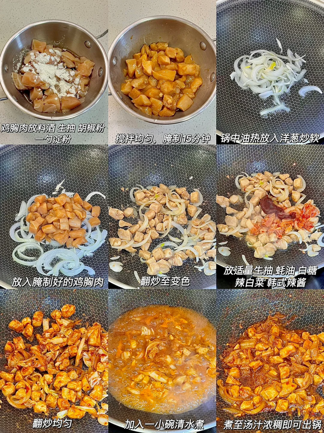 我家的春天真好吃 今日份一人食健康餐分享: 韩式辣白菜鸡肉拌饭 一杯茉莉花茶 . 食材:一块鸡胸肉 洋葱 辣白菜 韩式辣酱 做法如图上⬆️ . 有条件的把鸡胸肉换成鸡腿肉,会hi 好吃😋 都去给我做,这个真的巨下饭好吃😋